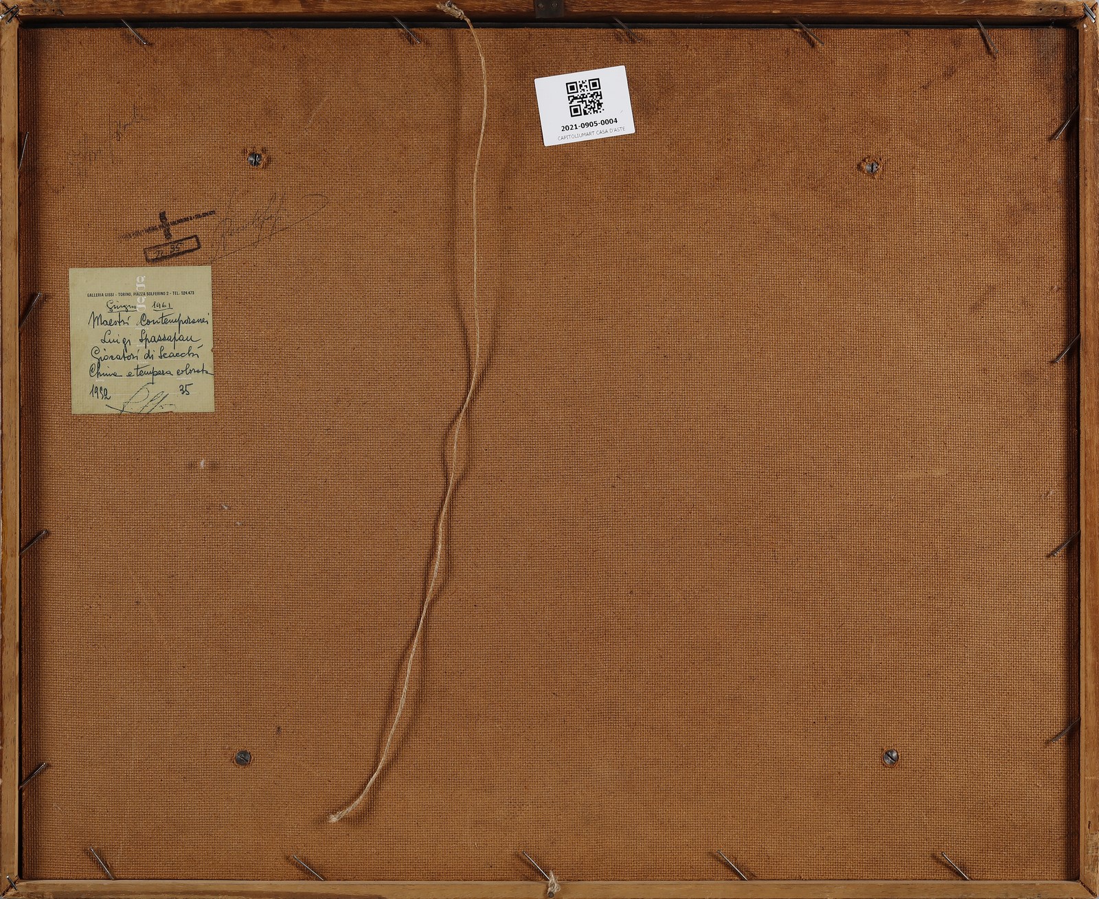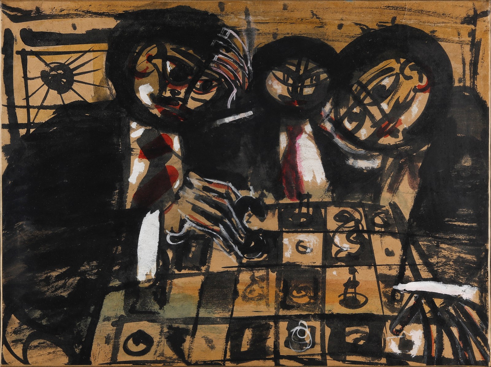SPAZZAPAN LUIGI (1889 - 1958) Giocatori di scacchi. 1952. Tecnica mista su carta. Cm 48,00 x 35,00. Al retro cartiglio descrittivo Galleria Gissi, Torino. Cornice presente