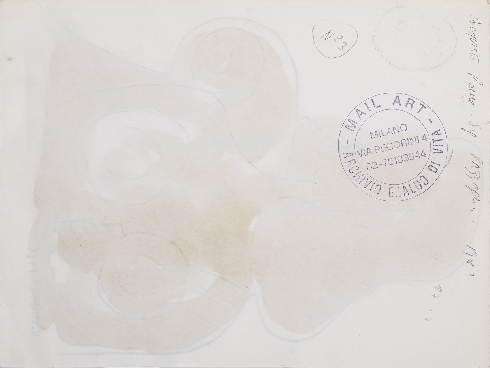LINDNER RICHARD (1901 - 1978) Senza titolo. 1965. Tecnica mista su carta. Cm 16,50 x 22,00. Firma e anno in basso a sinistra. Al retro timbro Mail Art, Milano. Cornice presente