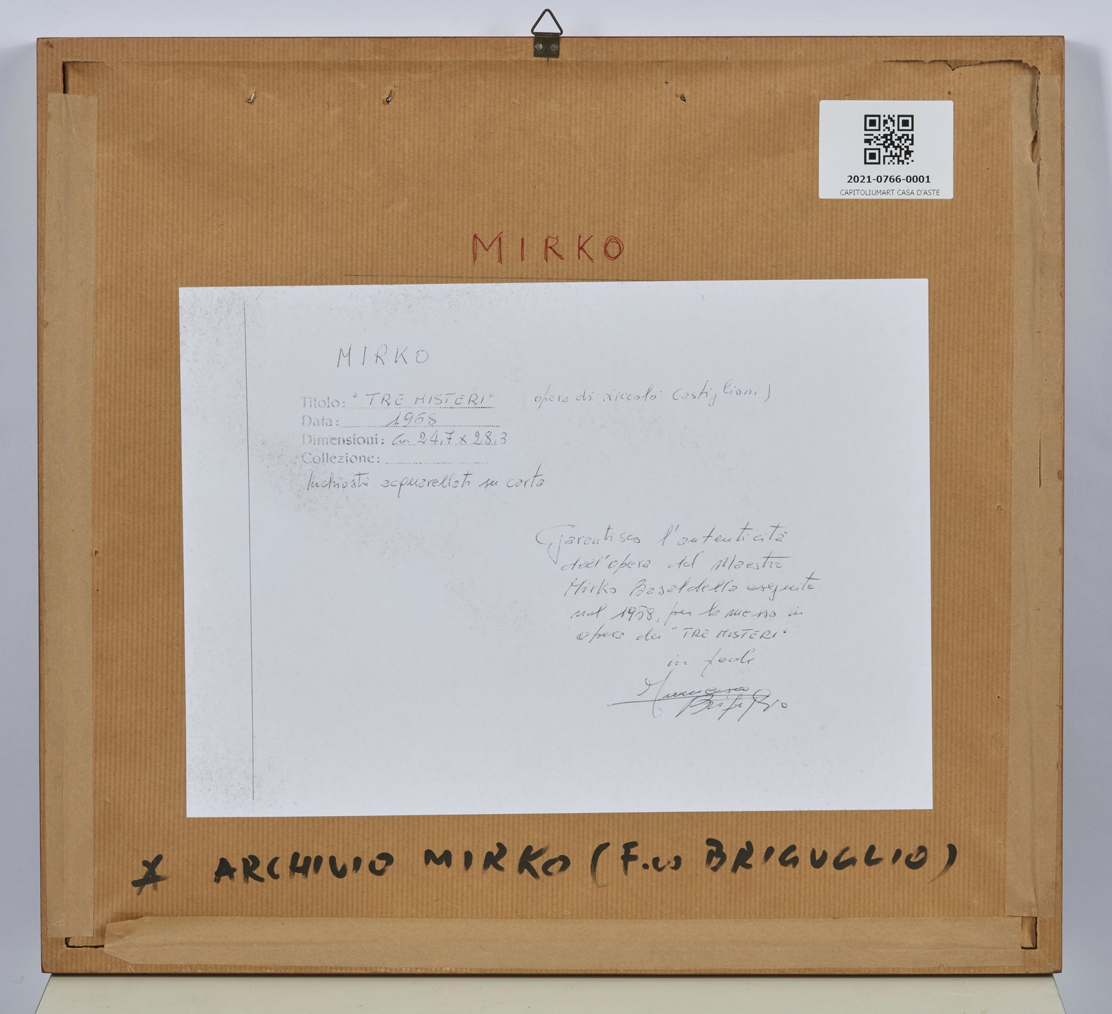 BASALDELLA MIRKO (1910 - 1969) Tre misteri. 1968. Tecnica mista su carta. Cm 28,30 x 24,70. Autentica su fotografia di Francesco Briguglio.