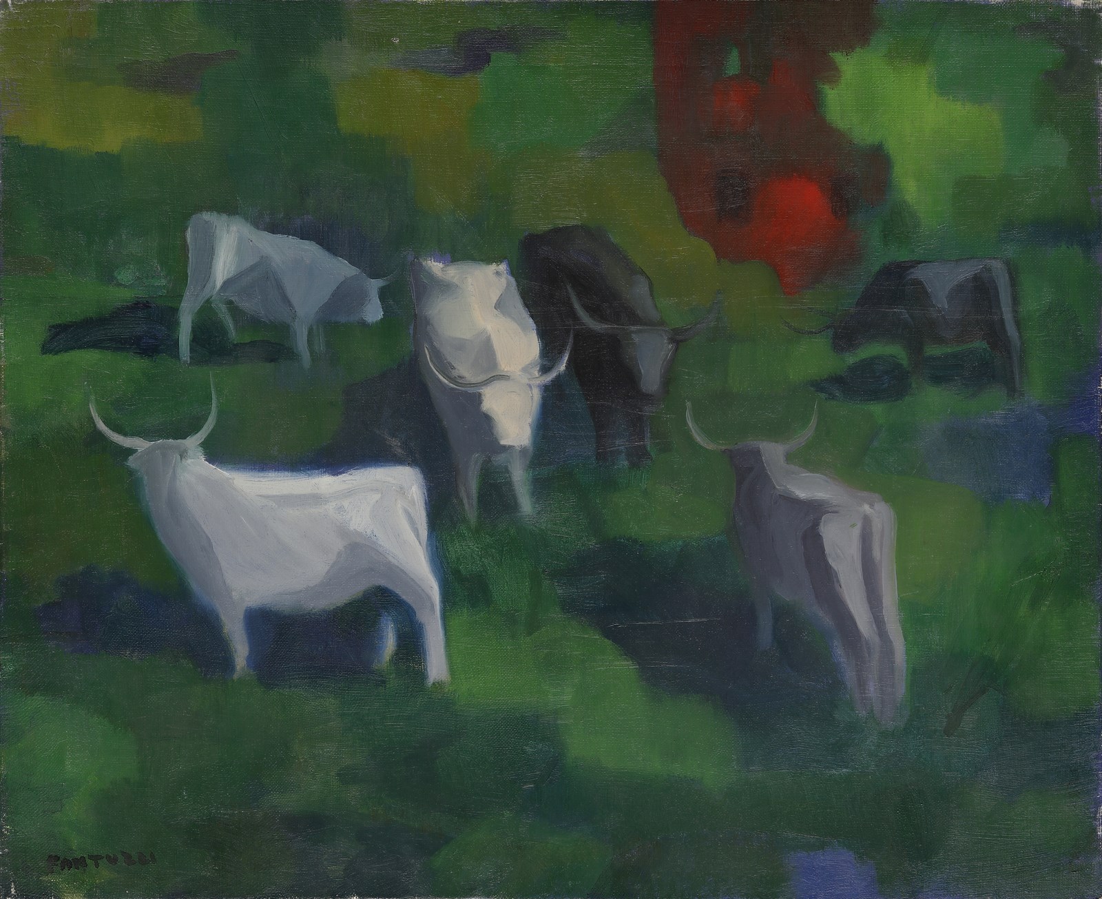 FANTUZZI ELIANO (1909 - 1987) Buoi. 1950. Olio su tela . Cm 49,00 x 39,00. Firma in basso a sinistra. Al retro titolo, firma e anno. Lievi difetti.