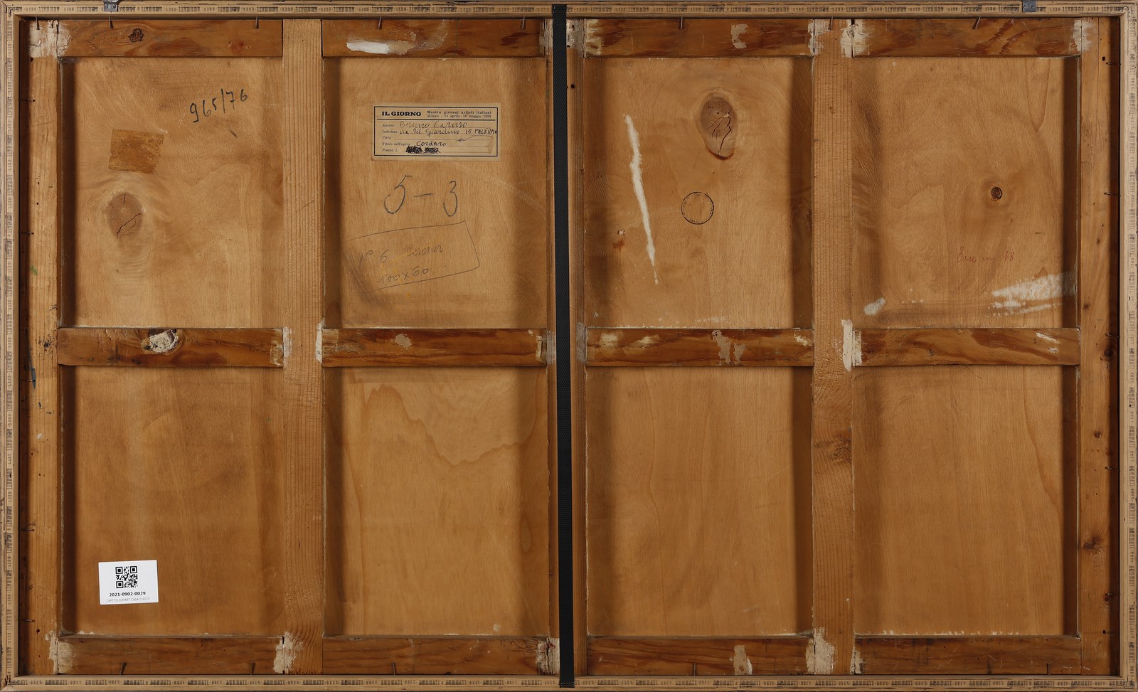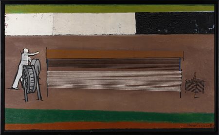 CARUSO BRUNO (n. 1927) Senza titolo. 1957. Olio su tavola. Cm 100,00 x 60,00. Firma e anno in basso a destra. Al retro cartiglio espositivo Il Giorno - Mostra giovani artisti italiani 1958. Pubblicazione: Catalogo della mostra personale dell'artista (allegato all'opera), tenuta presso la Galerie Rive Gauche, Rue Fleurus n.44, Parigi dal 29 Maggio al 18 Giugno 1959. Cornice presente