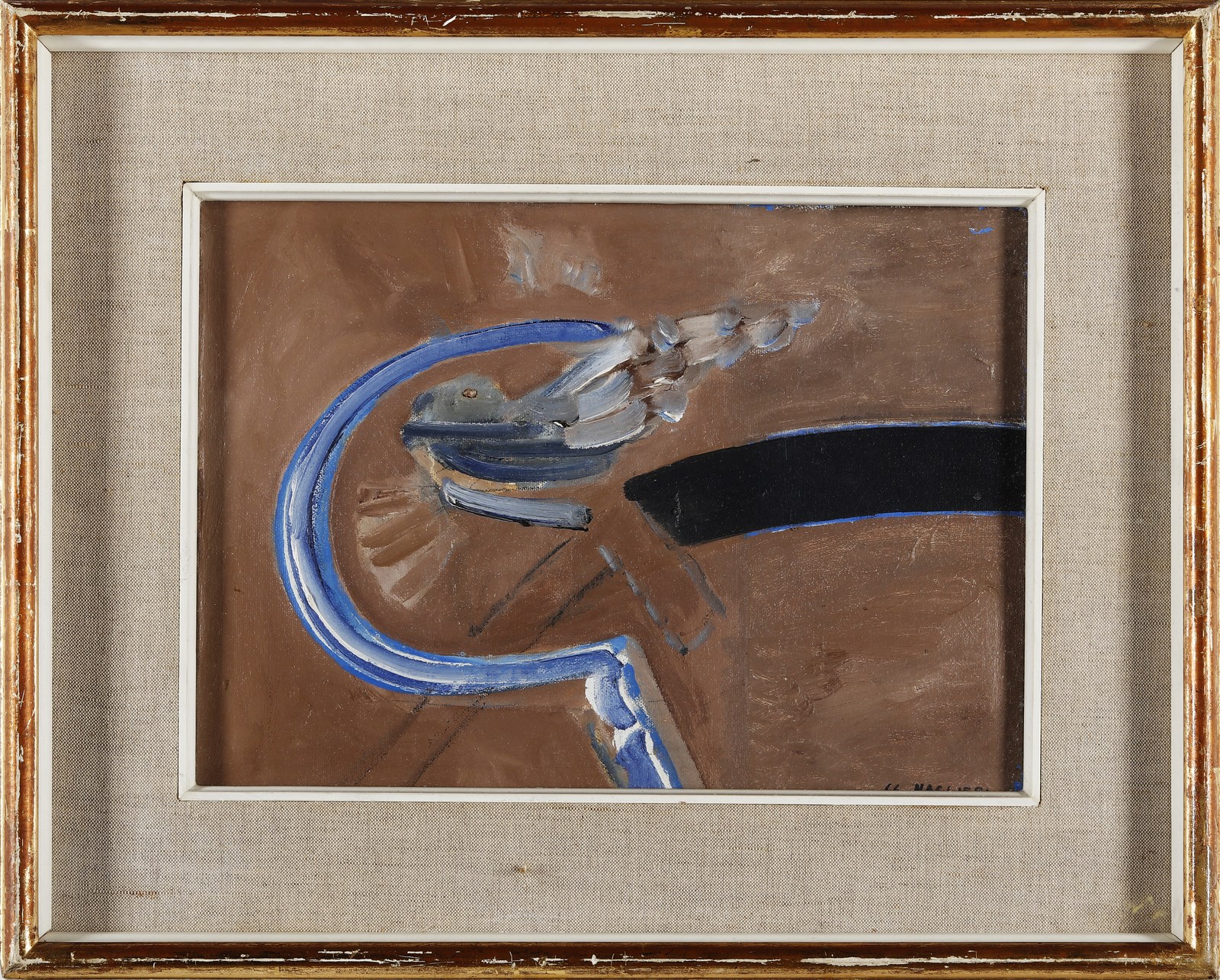 VAGLIERI TINO (1929 - 2000) Uccello con falce. 1966. Olio su tela . Cm 35,00 x 25,00. Firma e anno in basso a destra. Al retro titolo, firma e anno. Lievi difetti. Cornice presente