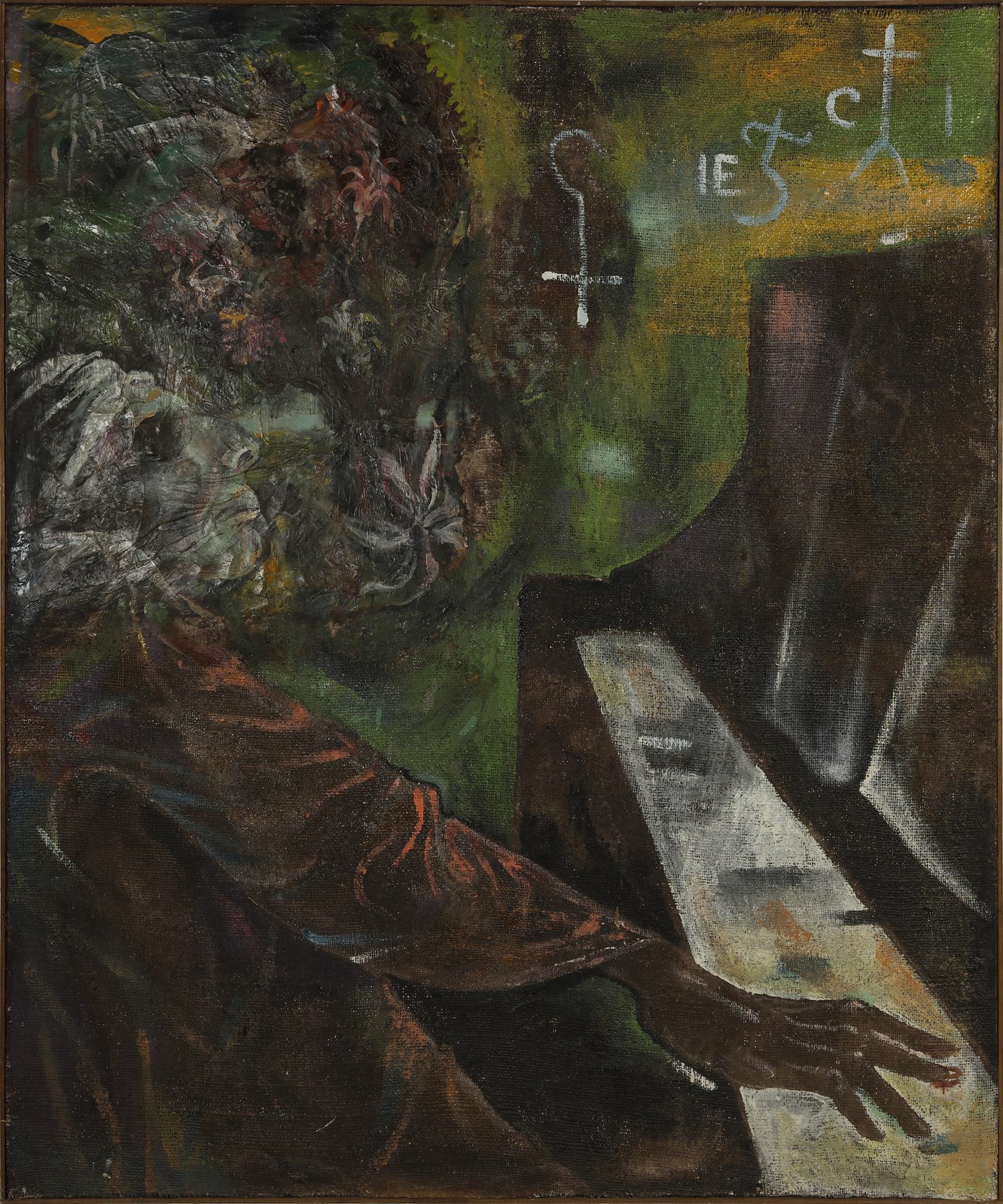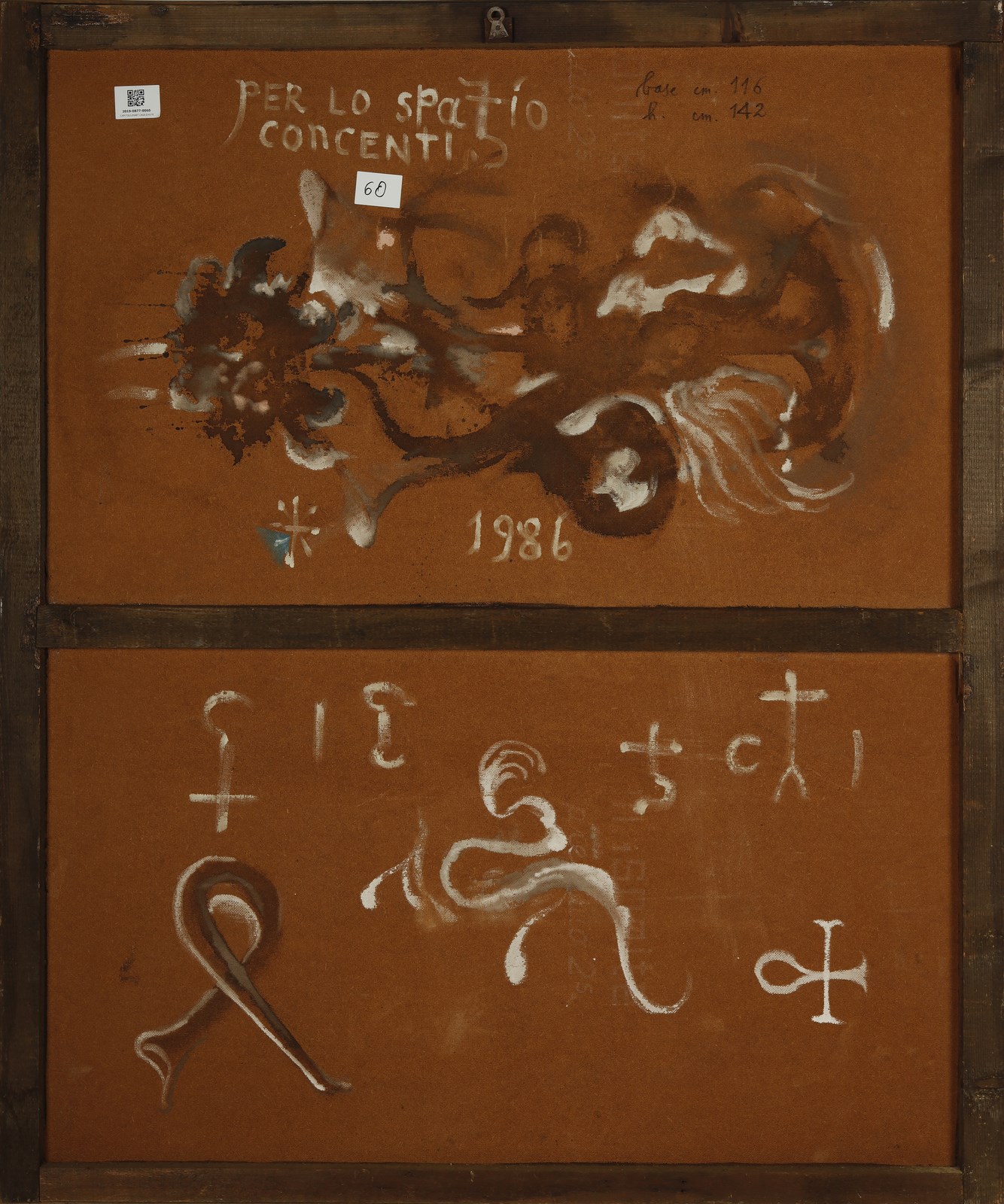 FIESCHI GIANNETTO (1921 - 2010) Per lo spazio concentrico. . 1986. Olio su tela incollata su tavola. Cm 116,00 x 141,00. Al retro titolo, firma e anno.