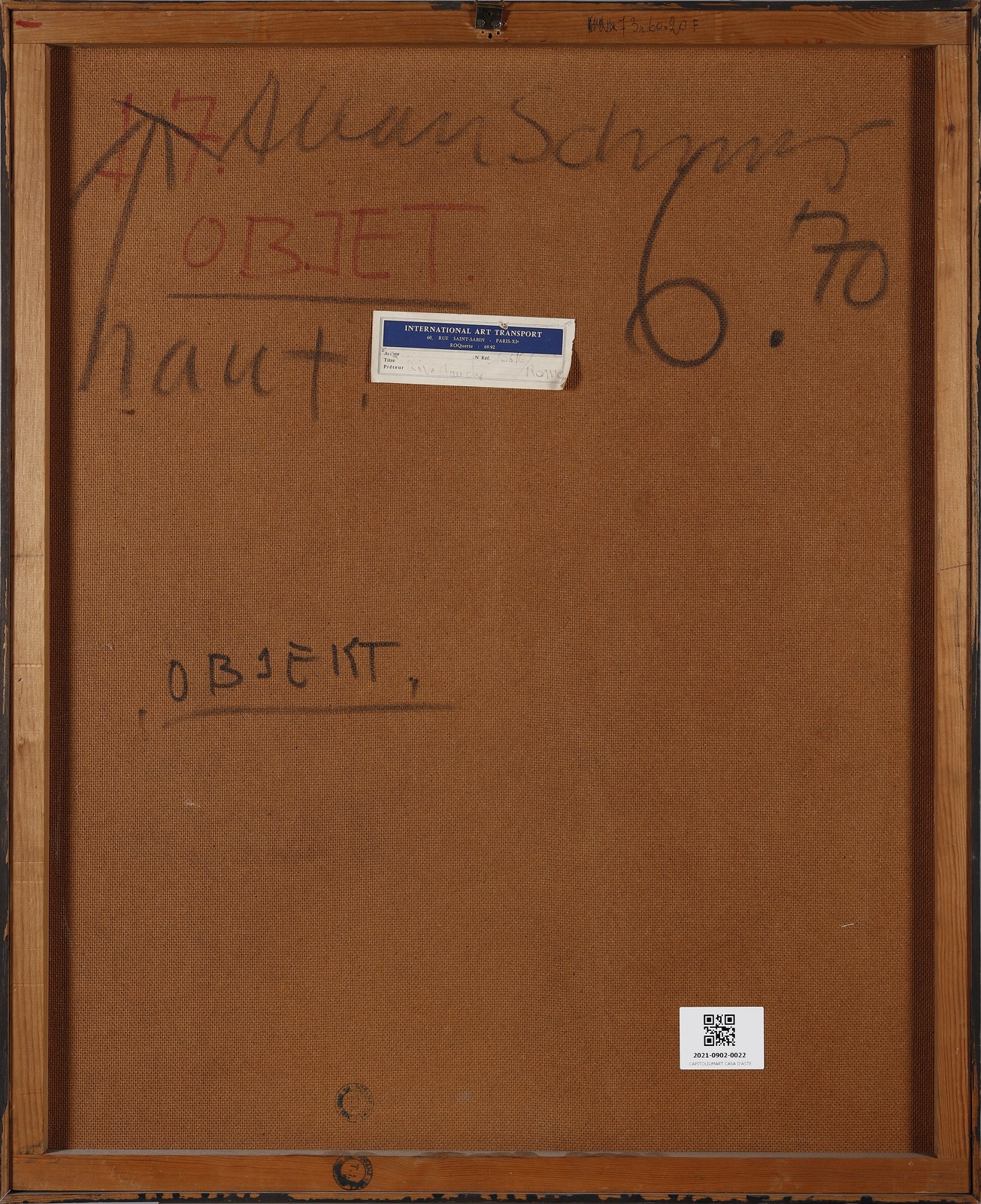 SCHMIDT ALLAN (1923 - 1989) Objet. 1970. tecnica mista collage su tavola. Cm 60,00 x 73,00. Al retro titolo, firma e anno. Autentica su fotografia con timbro Foto Elite, Roma. Provenienza: Galerie Rive Gauche, Rue Fleurus n.44, Parigi.