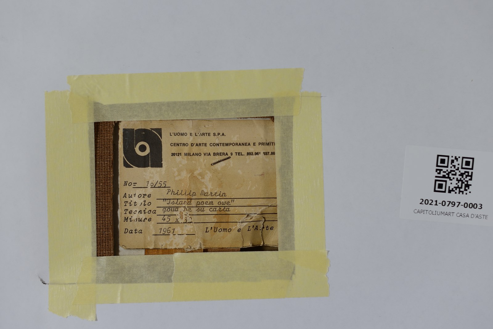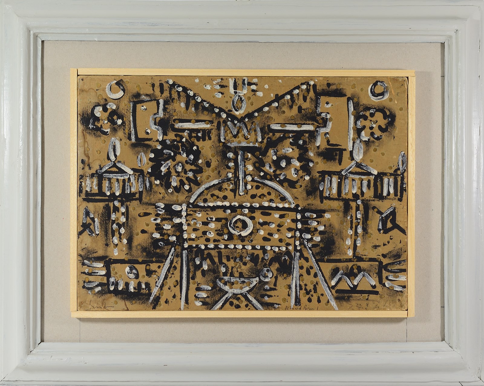MARTIN PHILIP (1927 - 2014) Island poem owe. 1961. Gouache su carta. Cm 32,00 x 45,00. Firma in basso a sinistra. Al retro etichetta "L'uomo e l'Arte Centro d'Arte Contemporanea e Primitiva" , Milano Via Brera 9. N. Archivio 10/55. Cornice presente