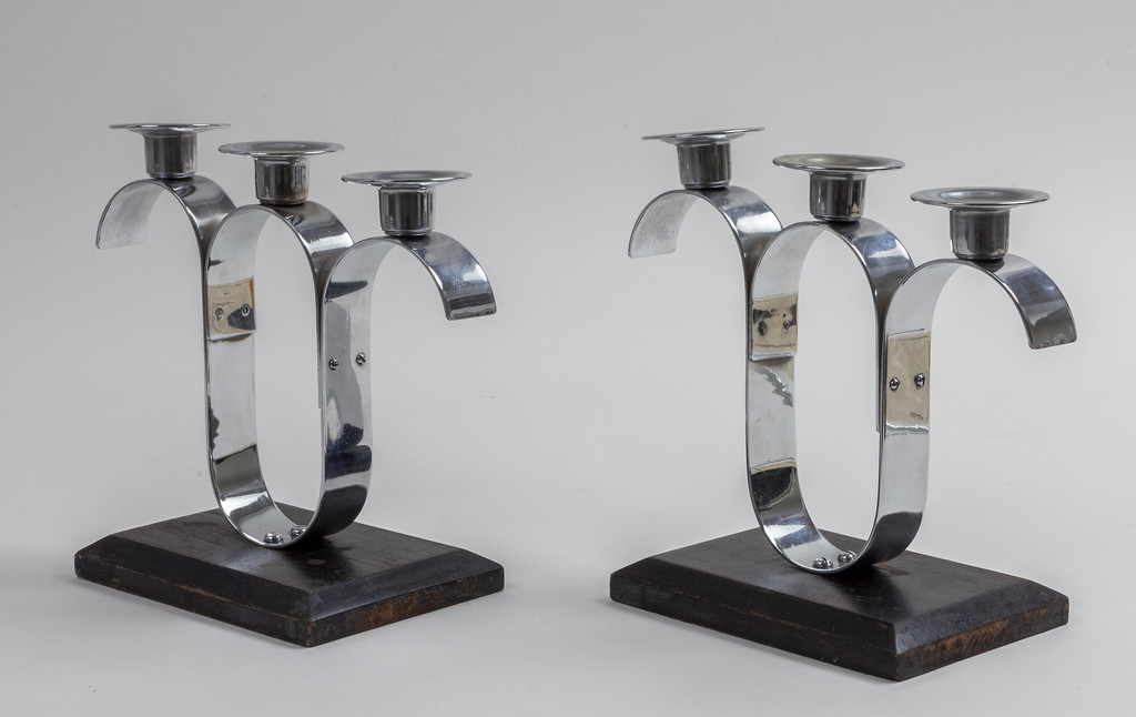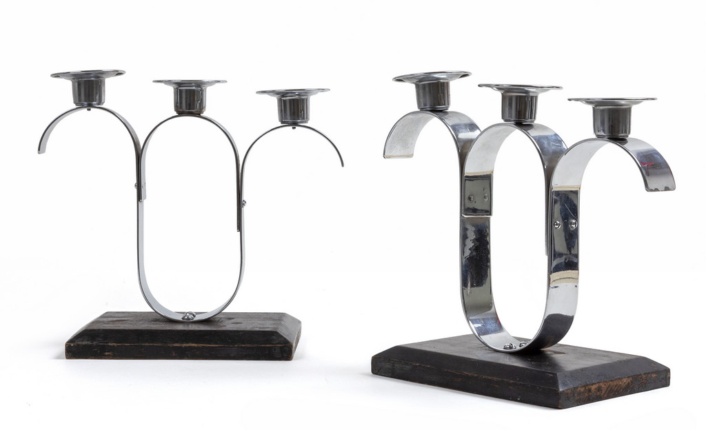 Lotto 3021 | DUE CANDELIERI, anni "30-"40. <br>Legno laccato,