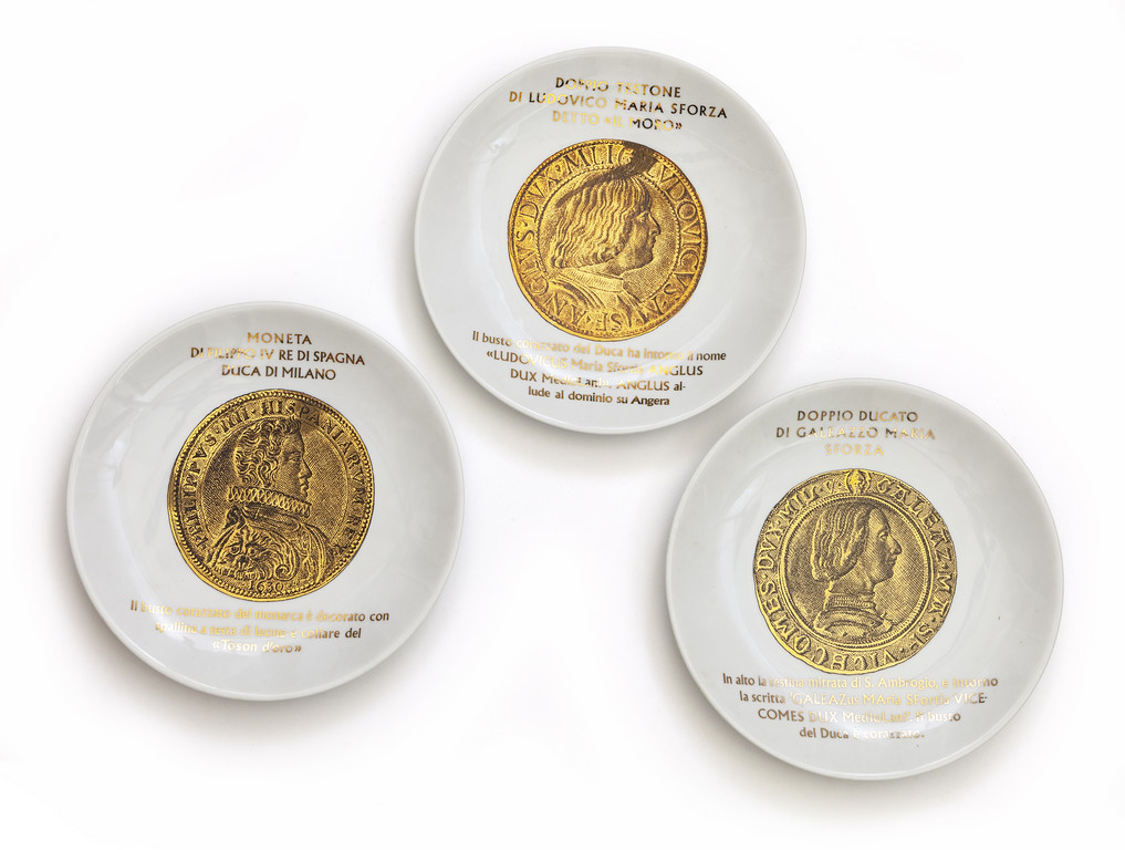 Tre piatti della serie "Monete del ducato di Milano"
