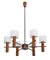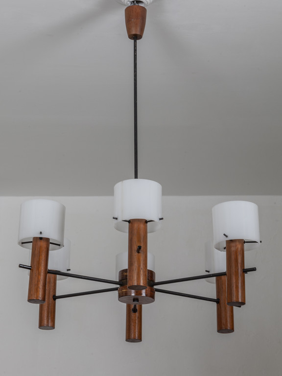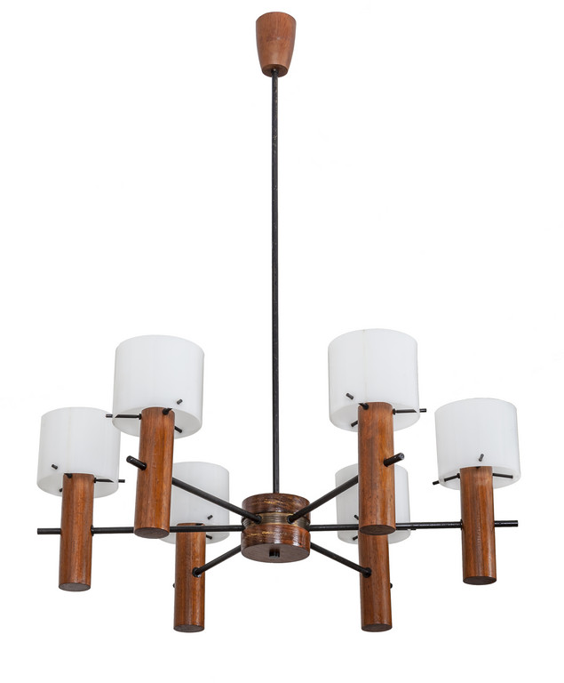 UN LAMPADARIO, anni '60. <br>Ottone, legno di