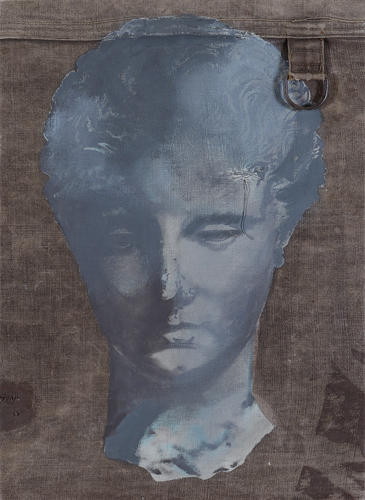 LUCA PIGNATELLI Milano 22/06/1962 Testa femminile, 2006 olio su telone di copertura di vagoni ferroviario cm. 70x50. titolo, firma, anno e località (Milano) al retro, dichiarazione d'autenticità dell'artista su foto, opera priva di cornice.
