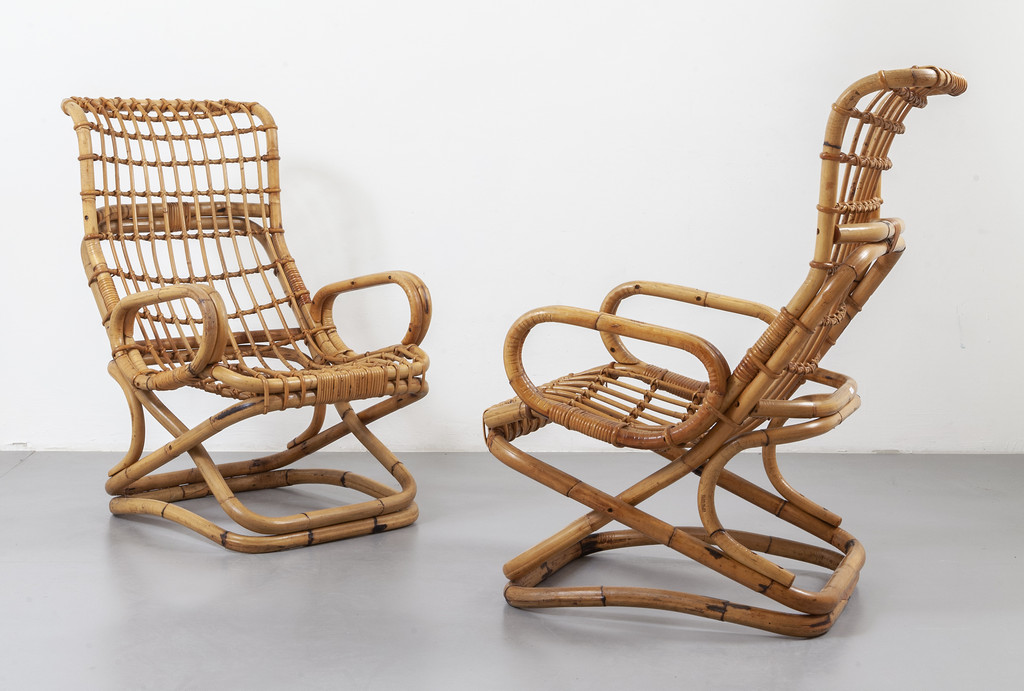 DUE POLTRONE, anni "60. <br>Malacca, giunco e