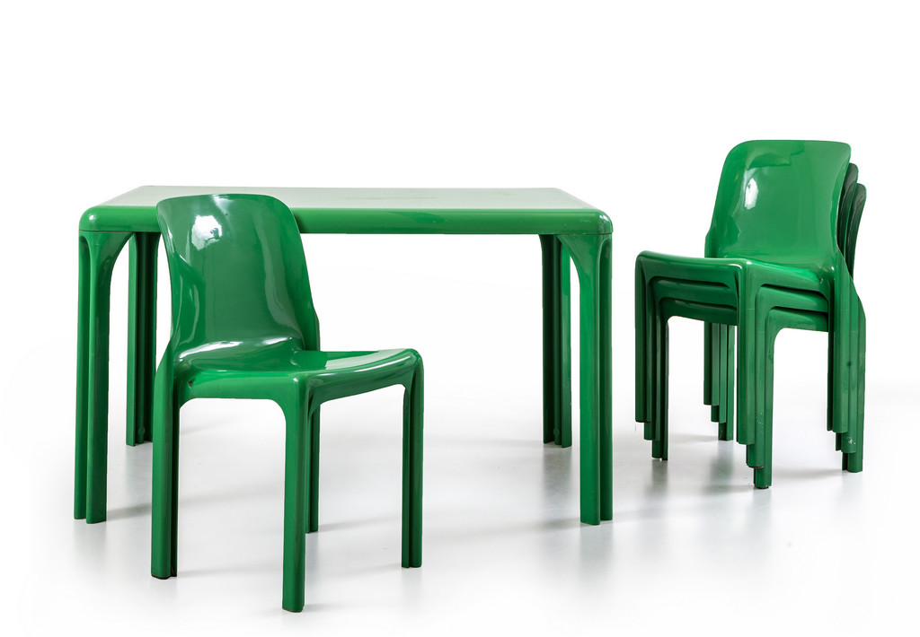 Un tavolo 'Stadio 120' (1970) e quattro sedie 'Selene' per ARTEMIDE, 1968.