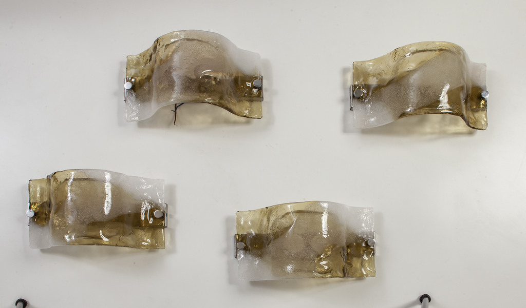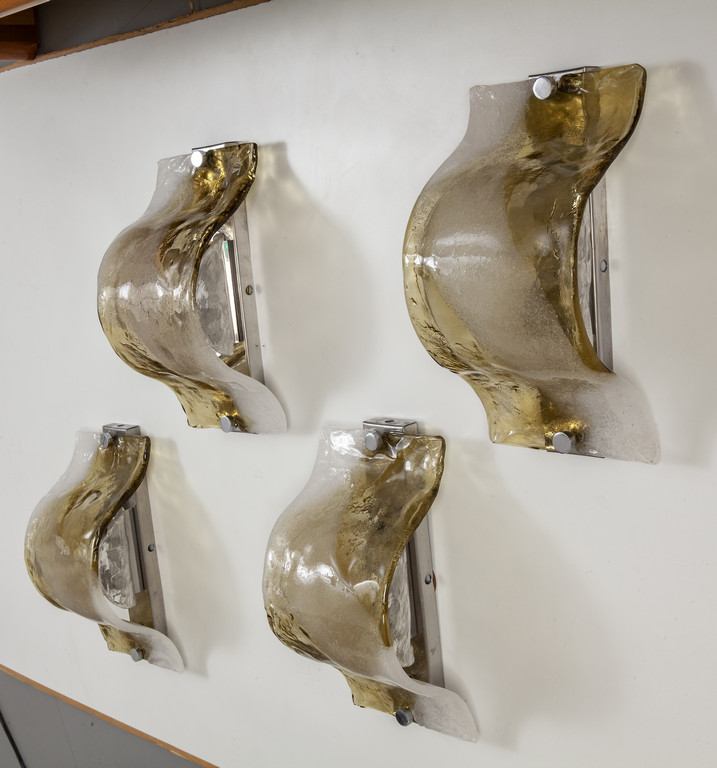 Quattro lampade da parete con supporti di acciaio cromato e diffusori di vetro lavorato a mano.