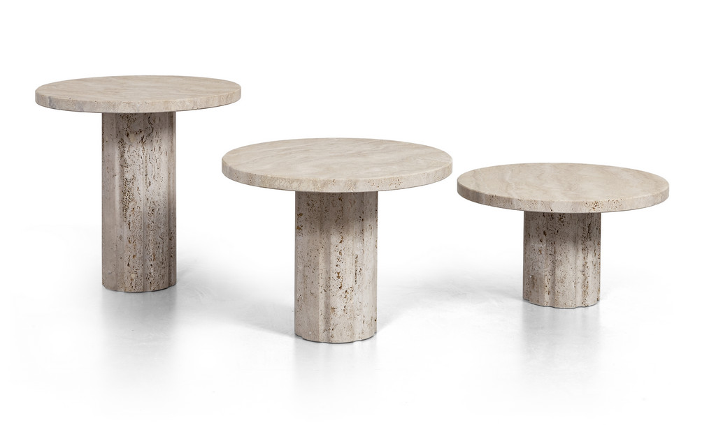 TRE TAVOLINI, anni '70. <br>Travertino.