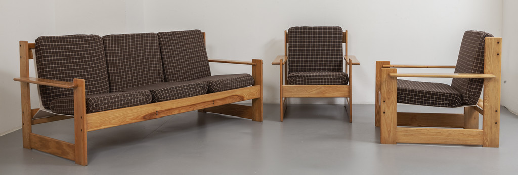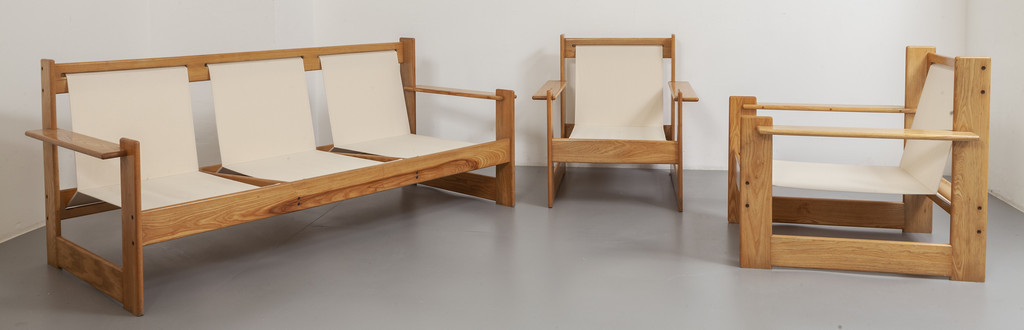 UN DIVANO E DUE POLTRONE, anni "70. <br>Legno di