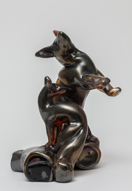Una scultura in vetro fumato di volpe con il suo cucciolo sul tronco, circa 1938