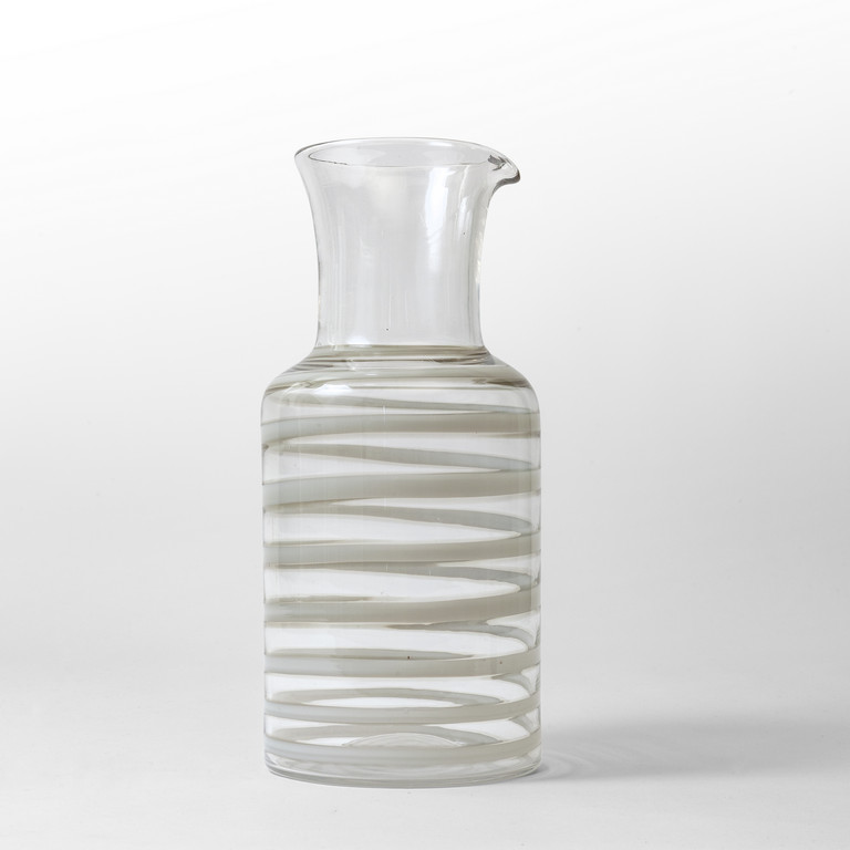 Una caraffa in vetro trasparente con decoro di spirale in lattimo, 1936
