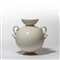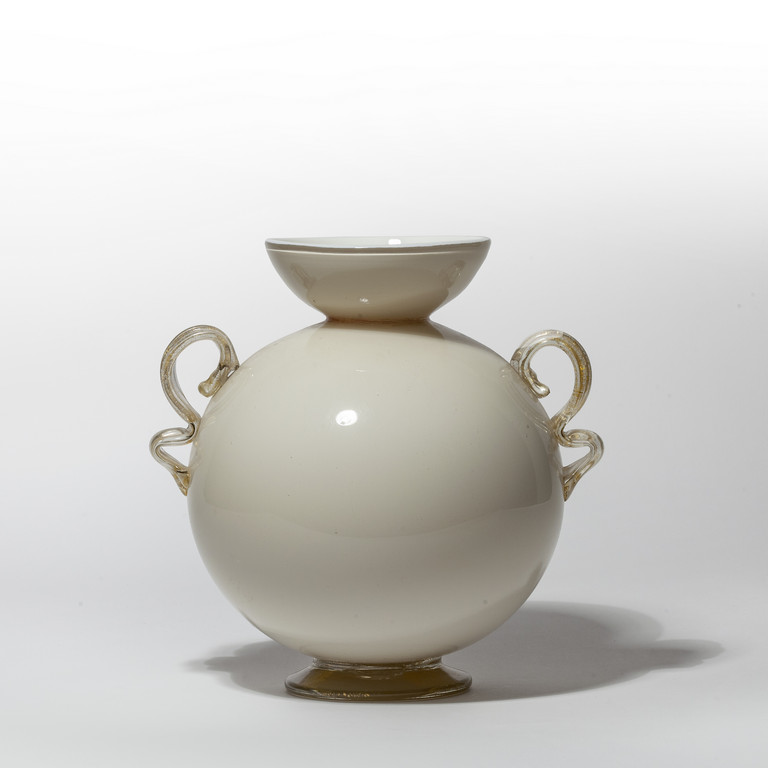 Un vaso in vetro incamiciato beige lattimo con applicazione di piede e due anse in cristallo
