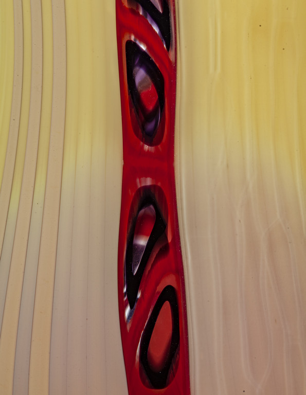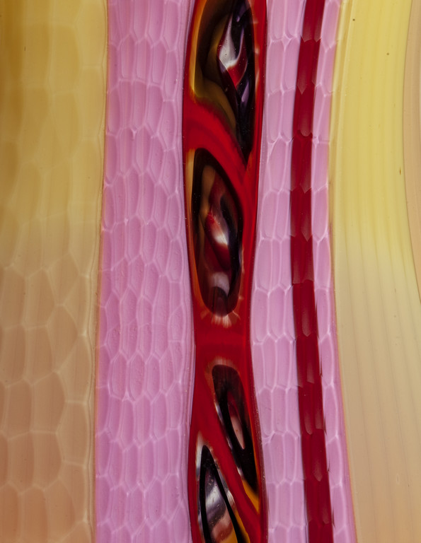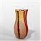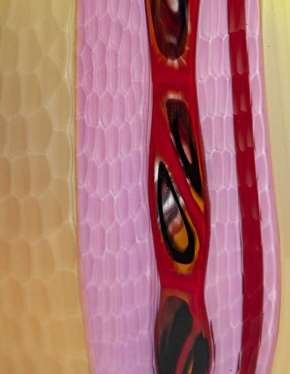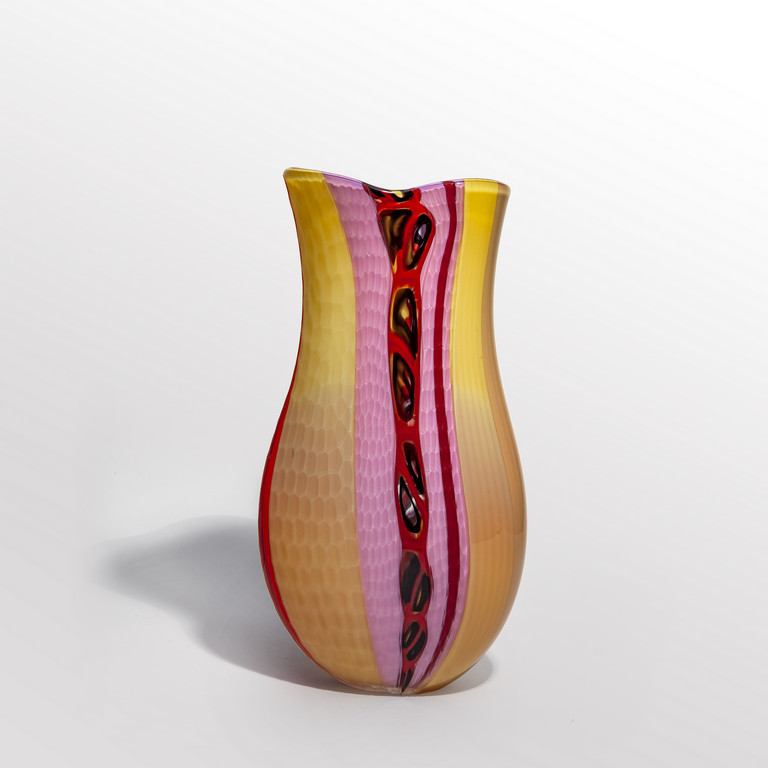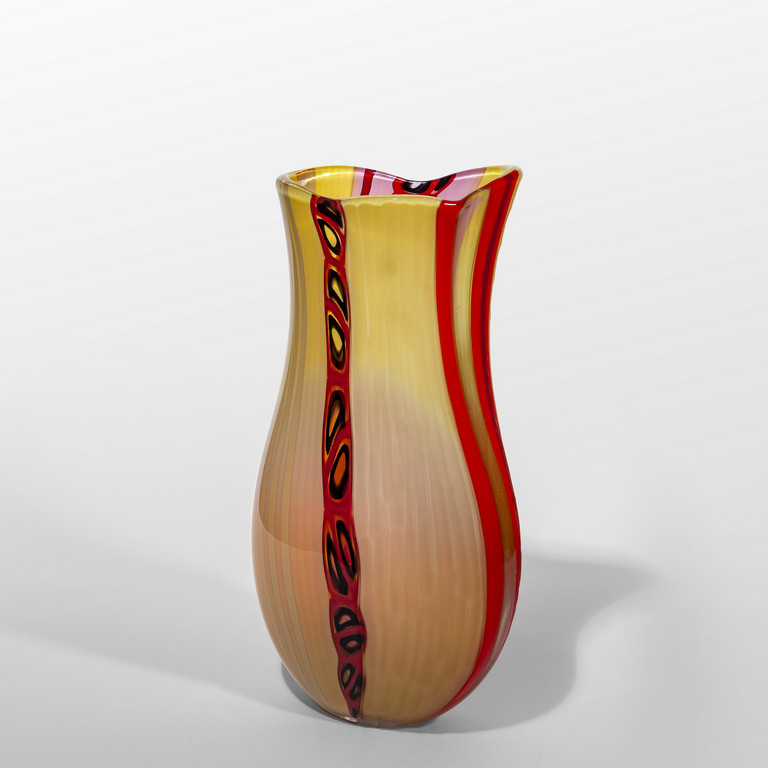 Un vaso in vetro a canne multicolore accostate a file verticali di murrine e superficie in