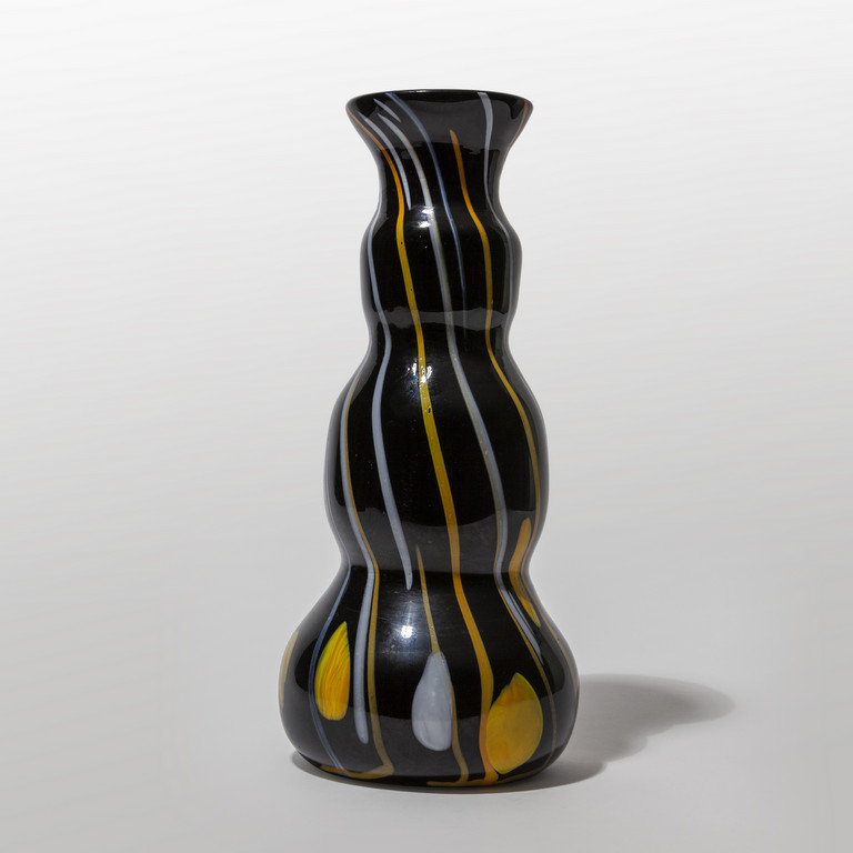 Un vaso in vetro nero a macchie e filamenti giallo e lattimo, circa 1920