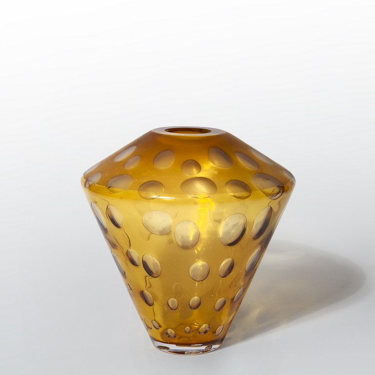 Un vaso in vetro ambra con grandi bolle regolari incluse e parte superiore satinata, circa