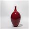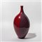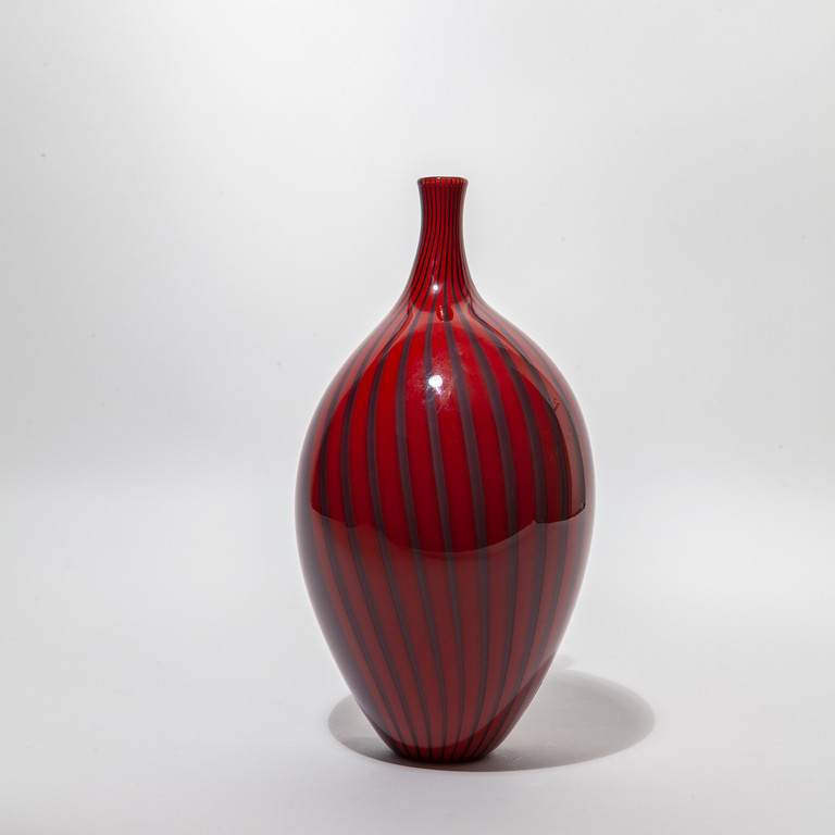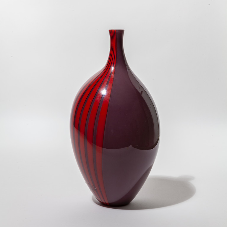 Una bottiglia della serie "giano" in vetro viola con canne color corallo su mezza superficie,