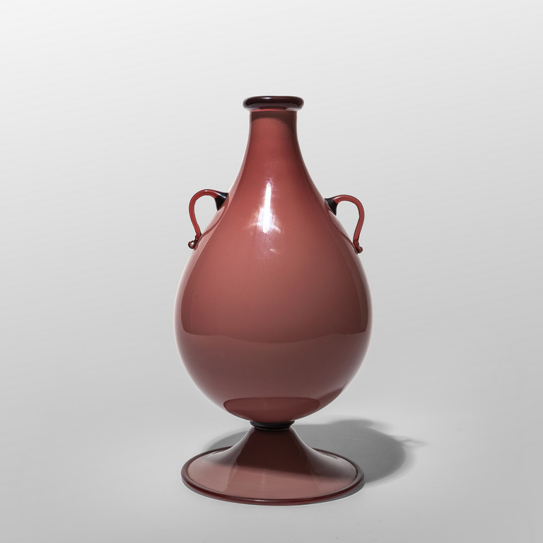 Un vaso in vetro incamiciato vinaccia con due ansette e bordi in vetro trasparente ametista,