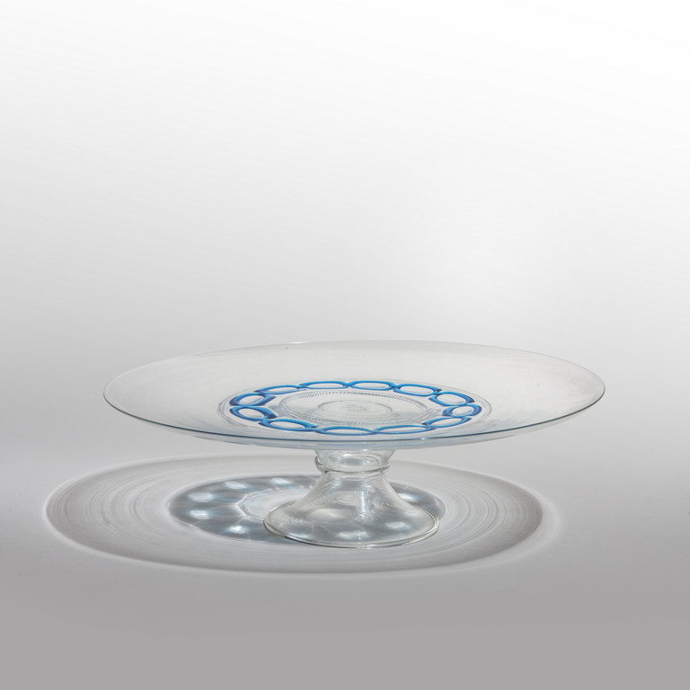 Una alzata in sottile vetro trasparente, decorata al piatto con motivo a catenella azzurro,