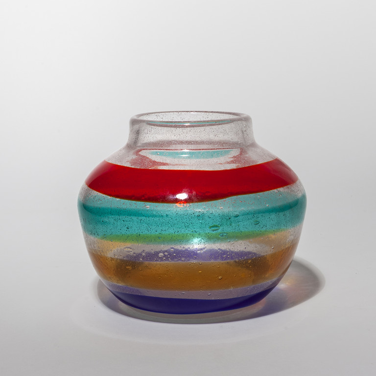 Un vaso in vetro trasparente a bollicine con applicazione di fasce colorate orizzontali, ca