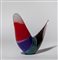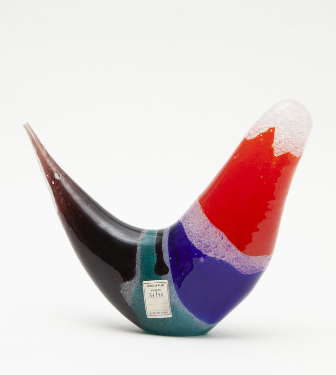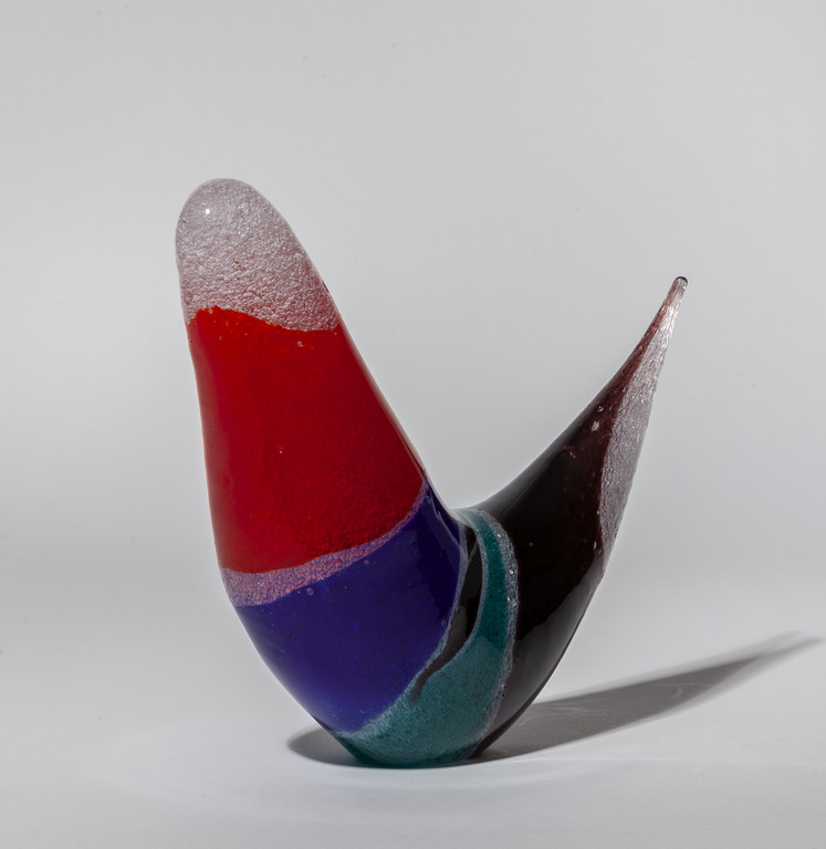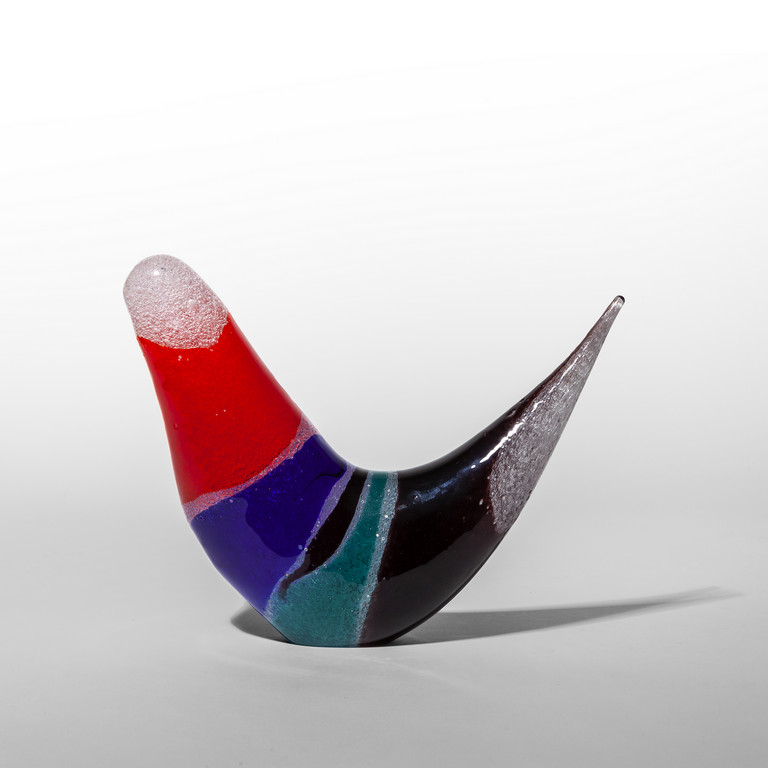 Figura di uccello in vetro a bollicine con applicazione di fasce colorate, ca 1970