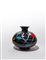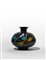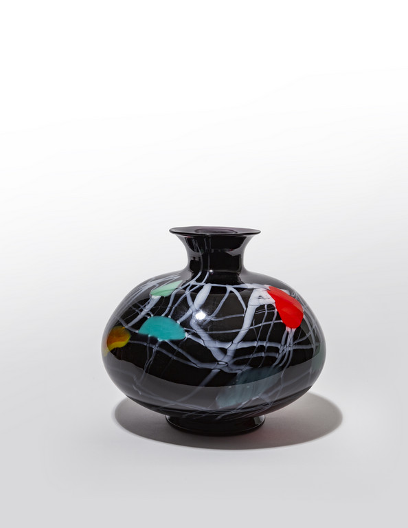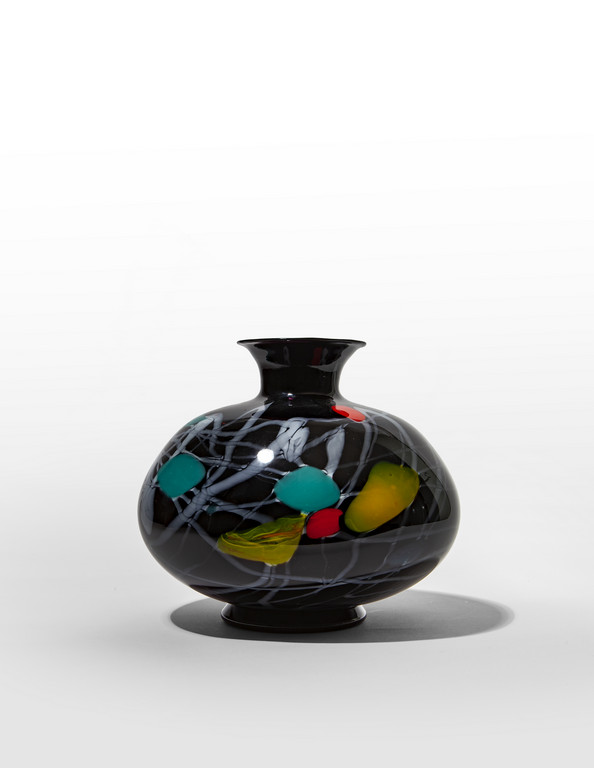 Un vaso bulbiforme in vetro nero con applicazione di macchie policrome e filamenti