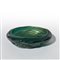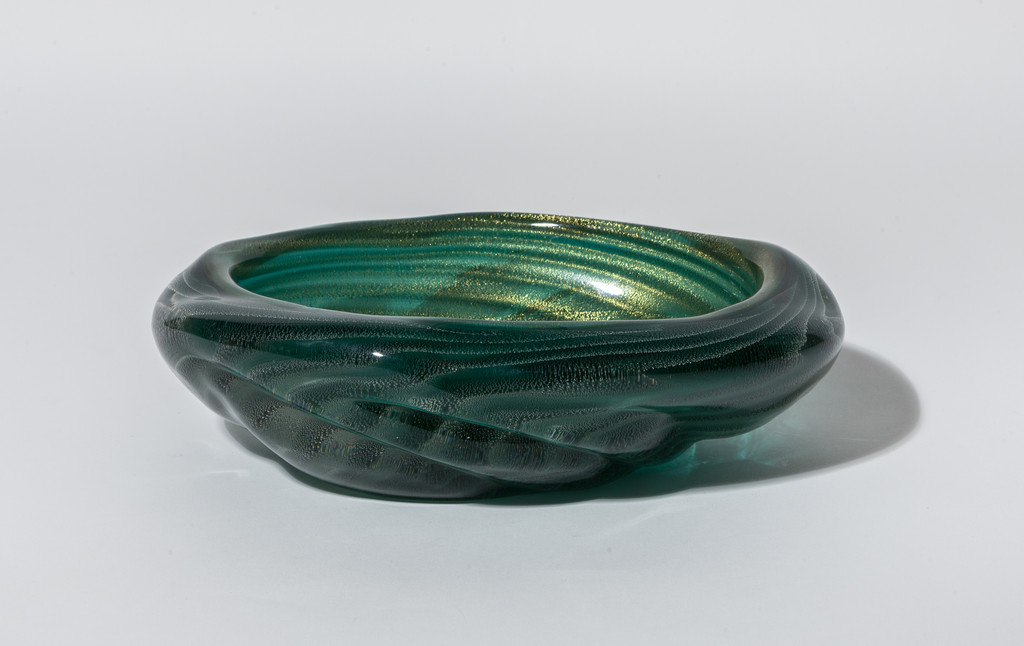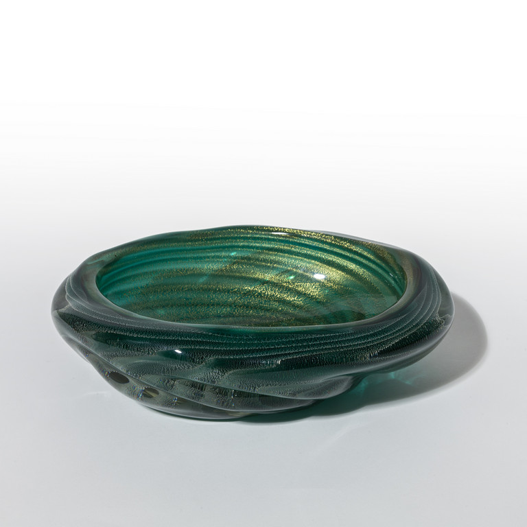 Una coppa ovale in vetro sommerso verde acqua a bollicine con applicazione di foglia oro,