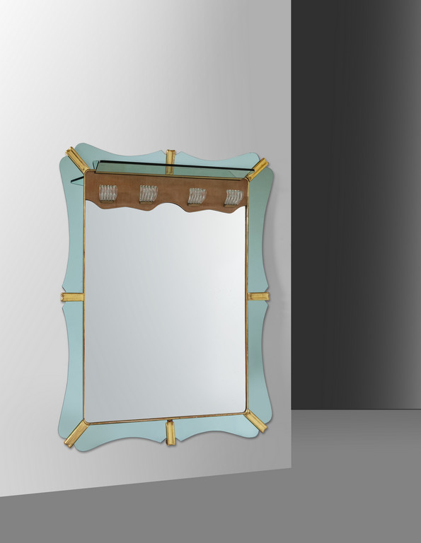 Walnut veneered wood, beveled crystal, brass,