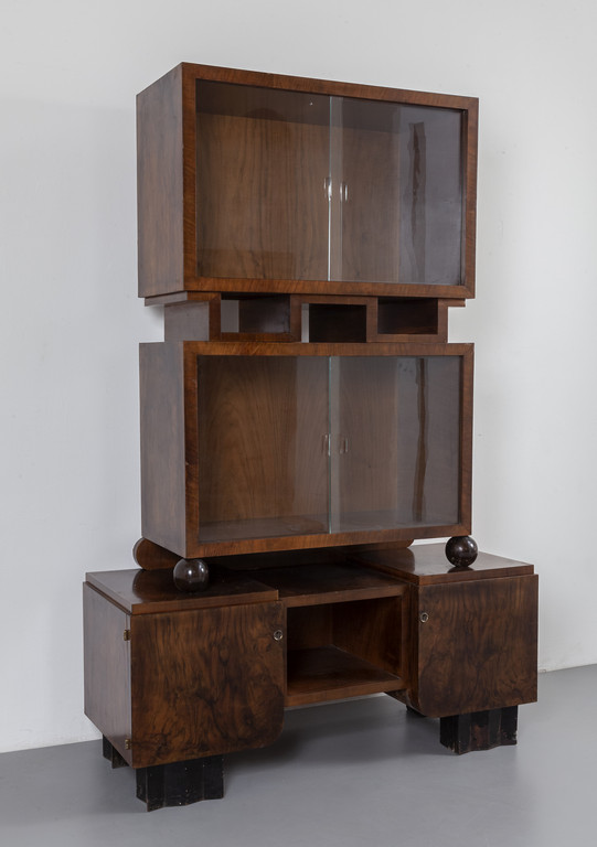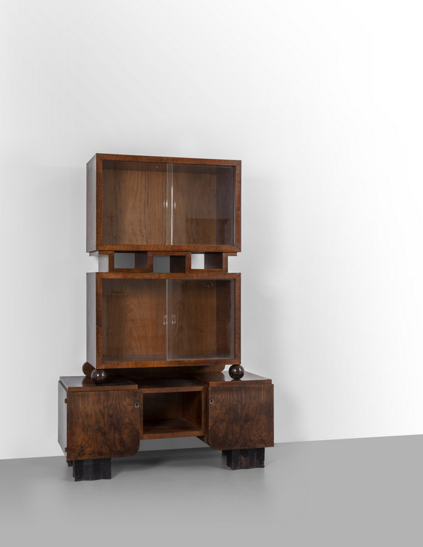 Legno impiallacciato in noce, ante scorrevoli in cristallo.