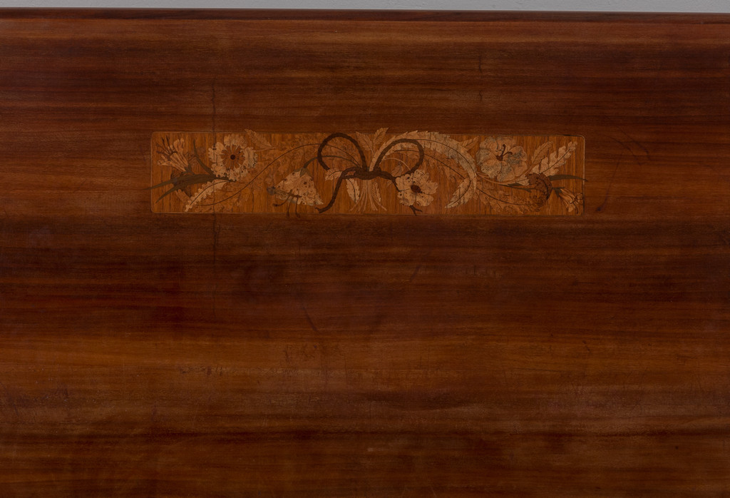 Legno impiallacciato in noce, tarsia in legni vari, puntali in fusione di