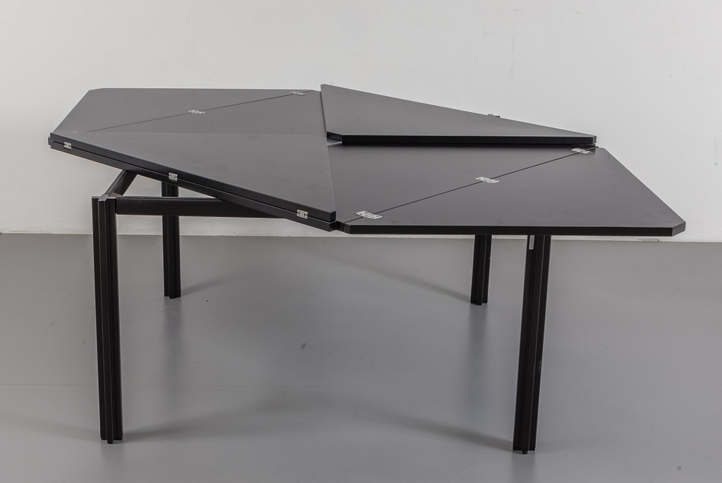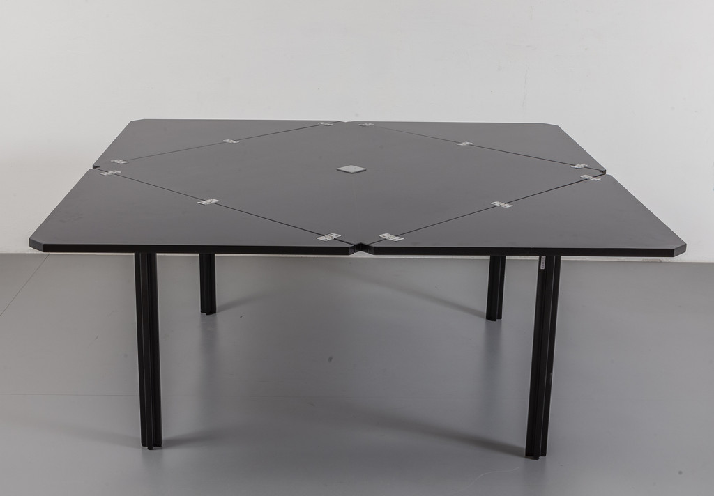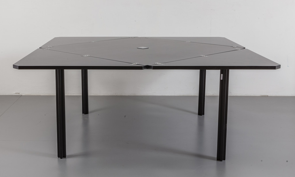 ampliabile con rotazione su un perno centrale e apertura di quattro ali a farfalla.