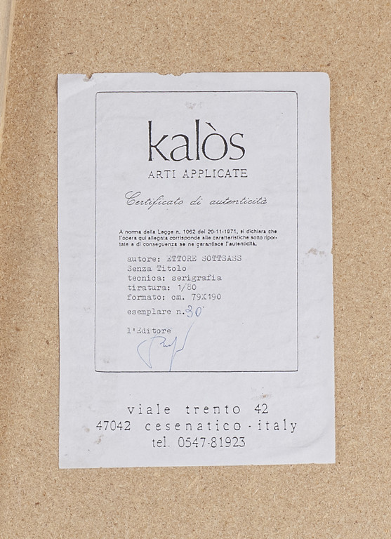 Signed "Sottsass 30/80. Manufacturer"s label on the back.