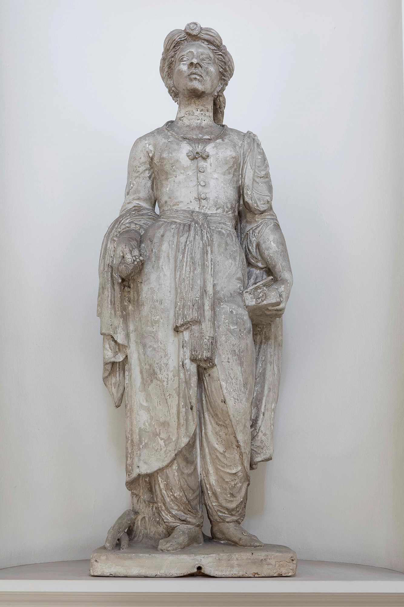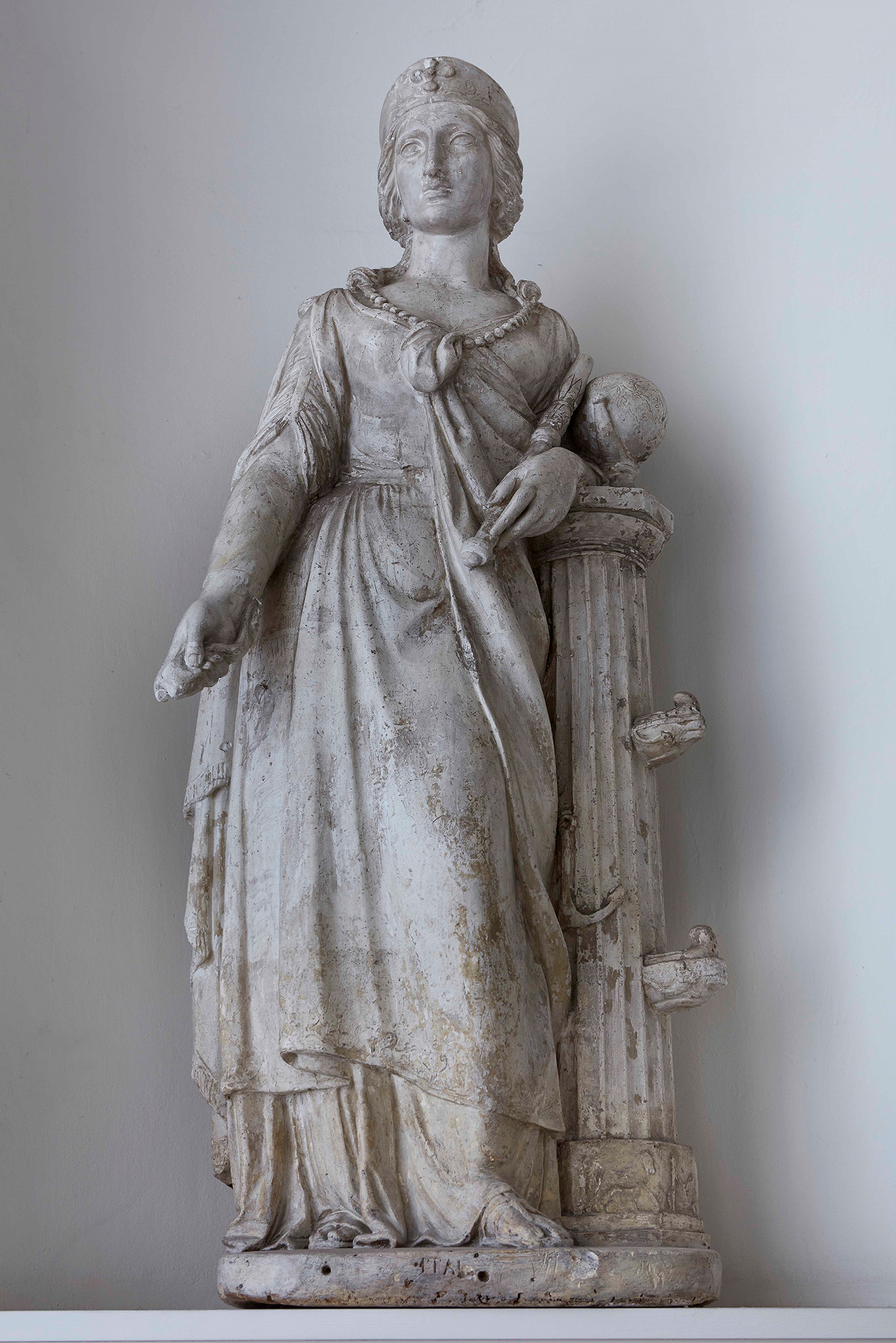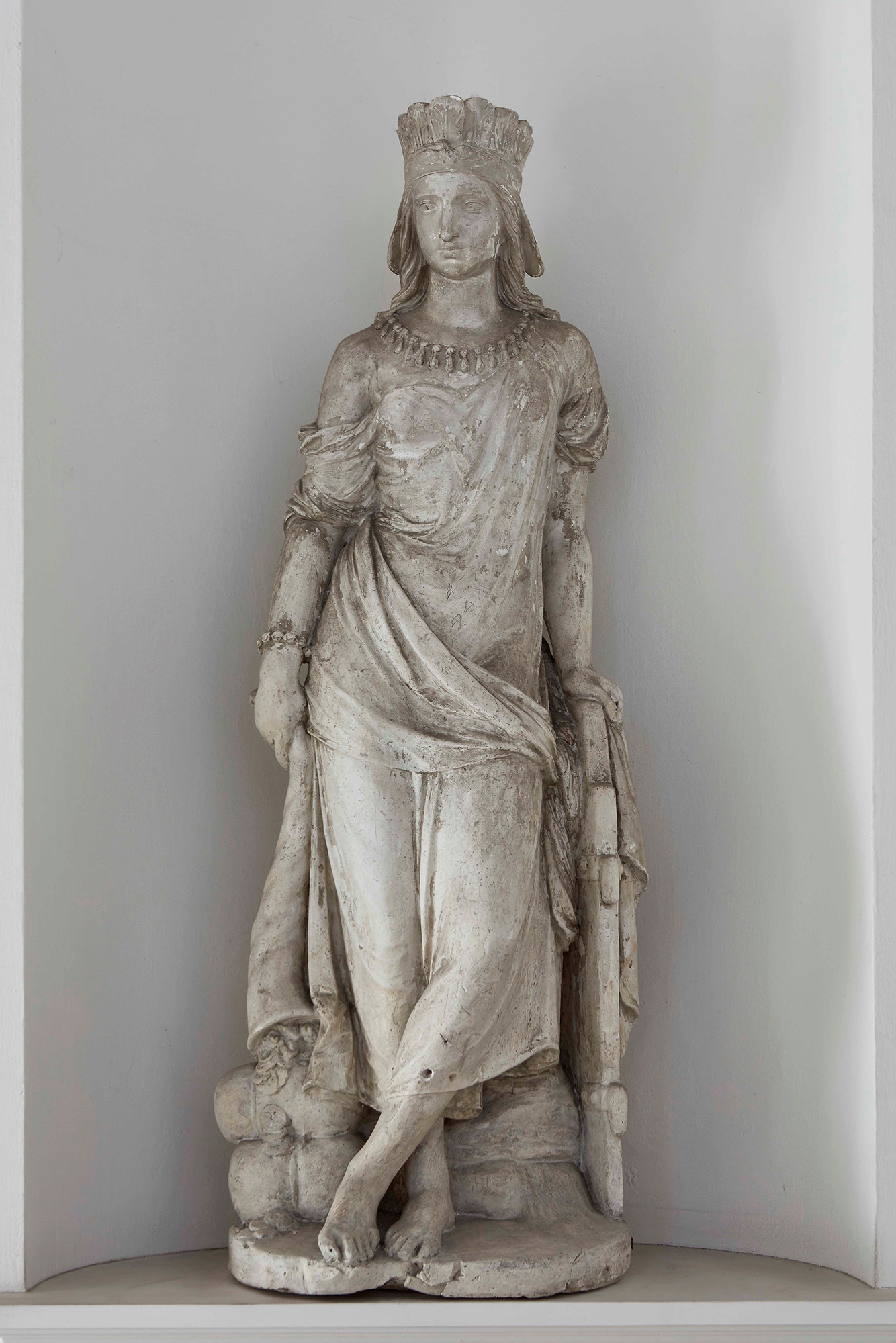 Allegoria dei quattro continenti. Stucco modellato. Arte del XIX secolo, Roma Recano iscrizioni: Roma 1850, 1857, 1858, 1859., L'importante gruppo allegorico raffigura quattro giovani donne, metafora ognuna di un continente; l'Africa è raffigurata come una fanciulla con una corta veste a fianco un cippo con iscrizioni egizie su cui è adagiata una pelle di leone mentre tiene un piede sul dorso di un coccodrillo, L'Asia vestita da un abito alla turca con pantaloni a sbuffo regge in una mano uno scrigno semi aperto da cui escono foglie di spezie, l'America dal copricapo piumato ornata di collana e bracciale stringe una cornucopia ed ai suoi piedi sacchi e imballi simboli di prosperità e commercio; infine l'Europa dalla testa cinta da una corona nell'atto di reggere uno scettro appoggiata ad una colonna rostrata che reca sulla sommità un globo terrestre simboli della supremazia sui mari e nelle scoperte di nuove terre, altezze cm 153, cm 155, cm 150 e cm 151, Parigi, mercato antiquario