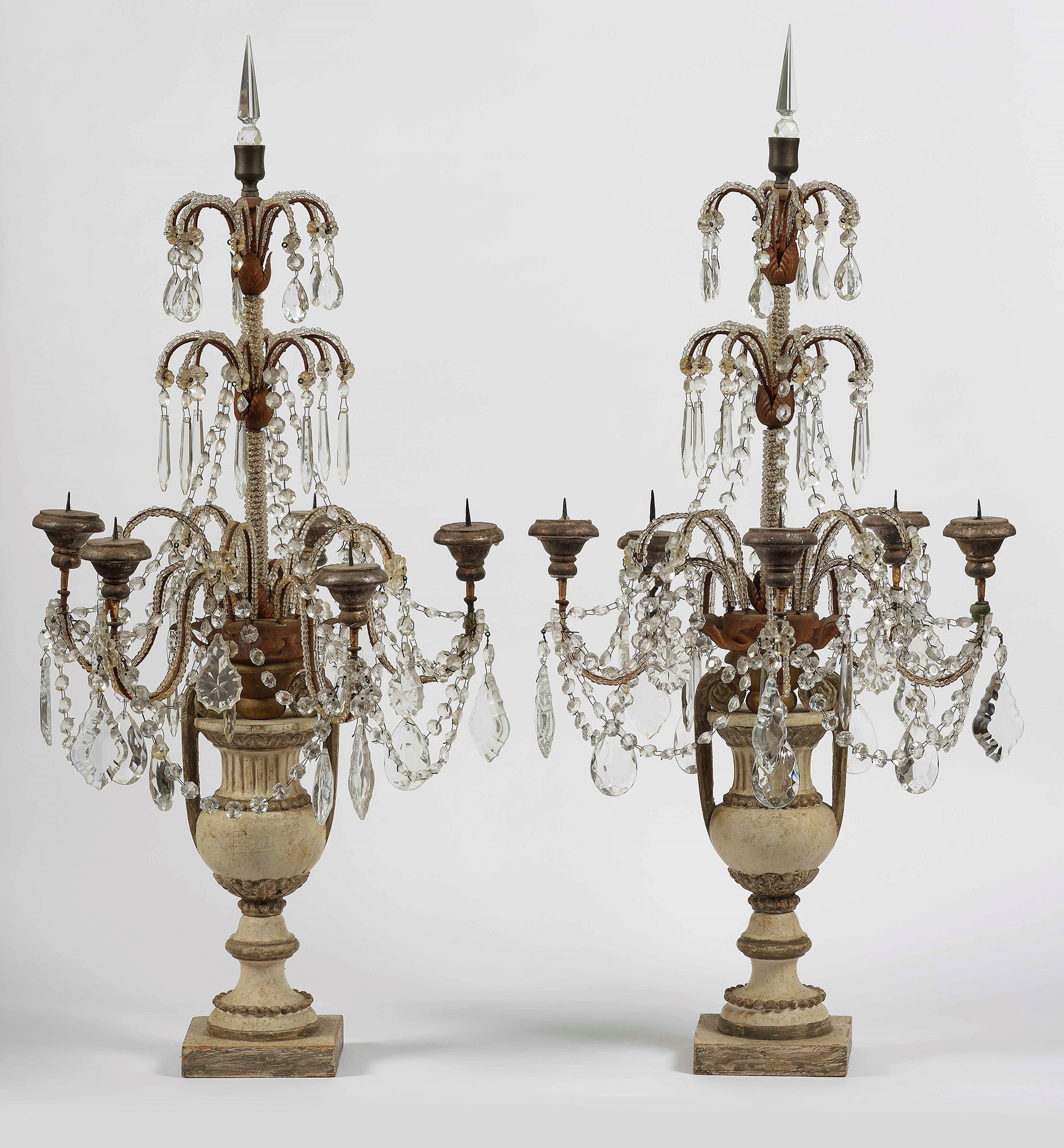 Coppia di girandoles a cinque fiamme. Legno intagliato, laccato e cristalli molati Il fusto in forma di vaso biansato da cui si dipartono cinque bracci mossi decorati a perlinature, pendagli e gocce in cristallo., H. 88 cm