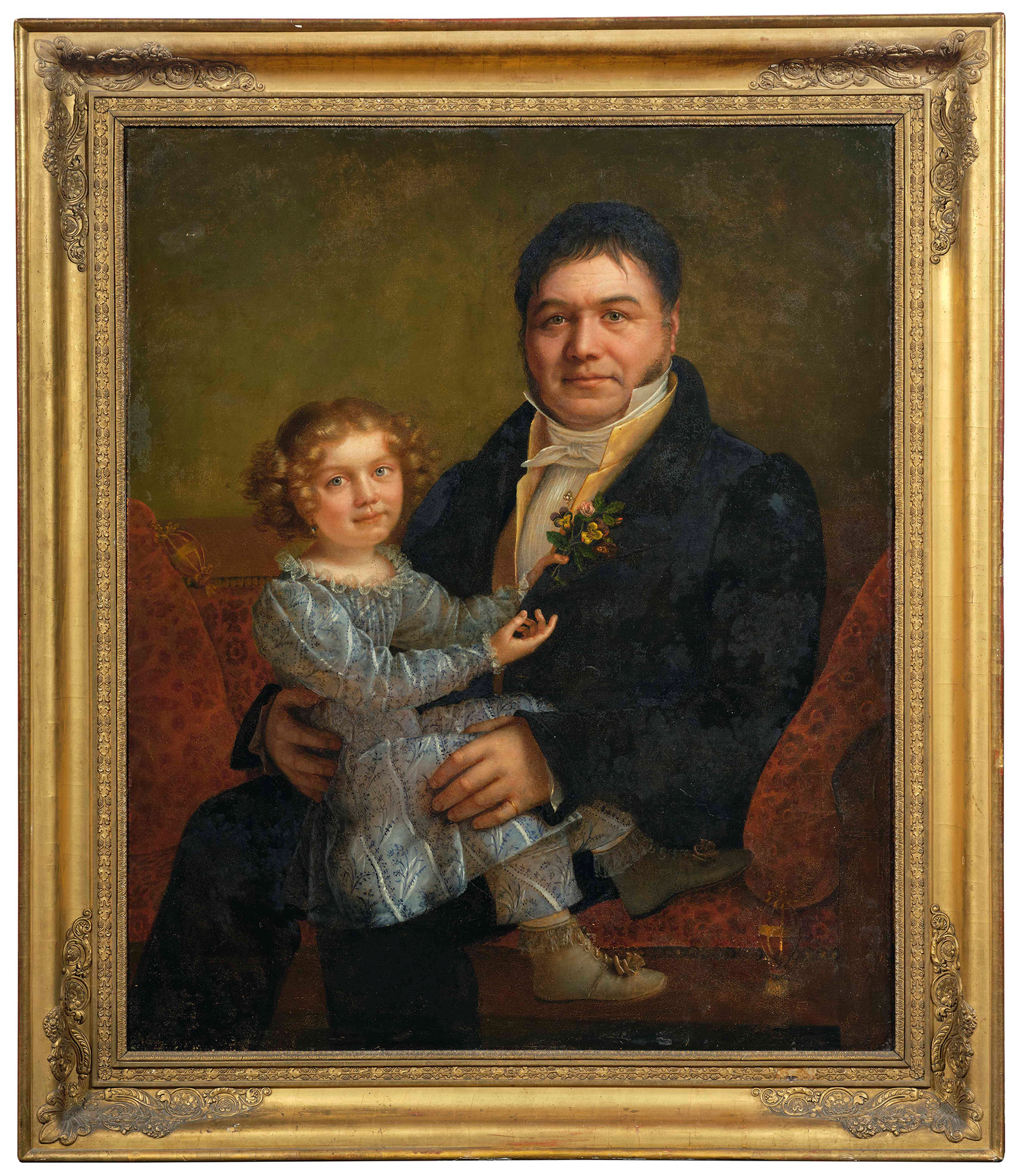 Ritratto di gentiluomo con bambina in grembo Scuola del XIX secolo in cornice dorata, olio su tela, W. 82 - H. 102 cm