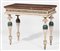 Tavolo da parete in legno intagliato, laccato con lumeggiature in oro. Piemonte XVIII secolo Fascia sottopiano intagliata a volute e motivi concatenati incorniciati da perlinatura in legno dorato. Gambe a balaustro parzialmente laccate in azzurro, decorate a nastri e foglie d'acanto. Piano lastronato in alabastro fiorito., W. 104,5 - D. 54,5 - H. 91 cm, Il Ponte Casa d’Aste, Renzo Mongiardino, Milano 14-15 aprile 1999, lotto 175