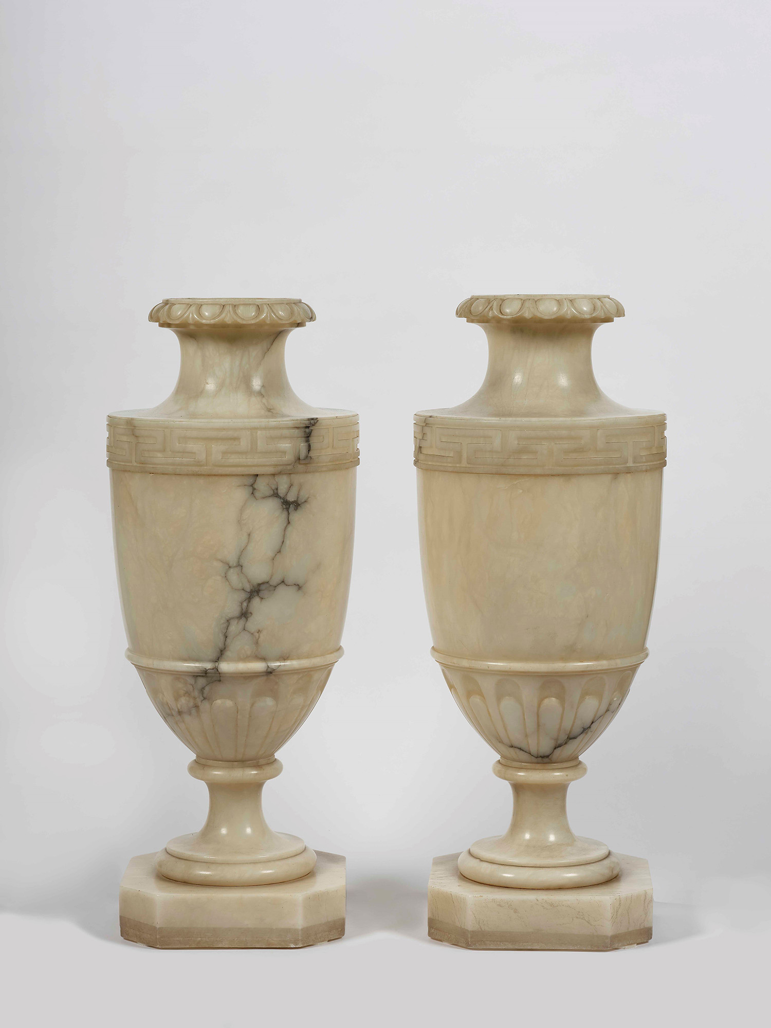 Coppia di vasi in alabastro. XX secolo Bordo modanato, fascia superiore a greche, fascia inferiore costolata. Montati a lampada, H. 60 Cm