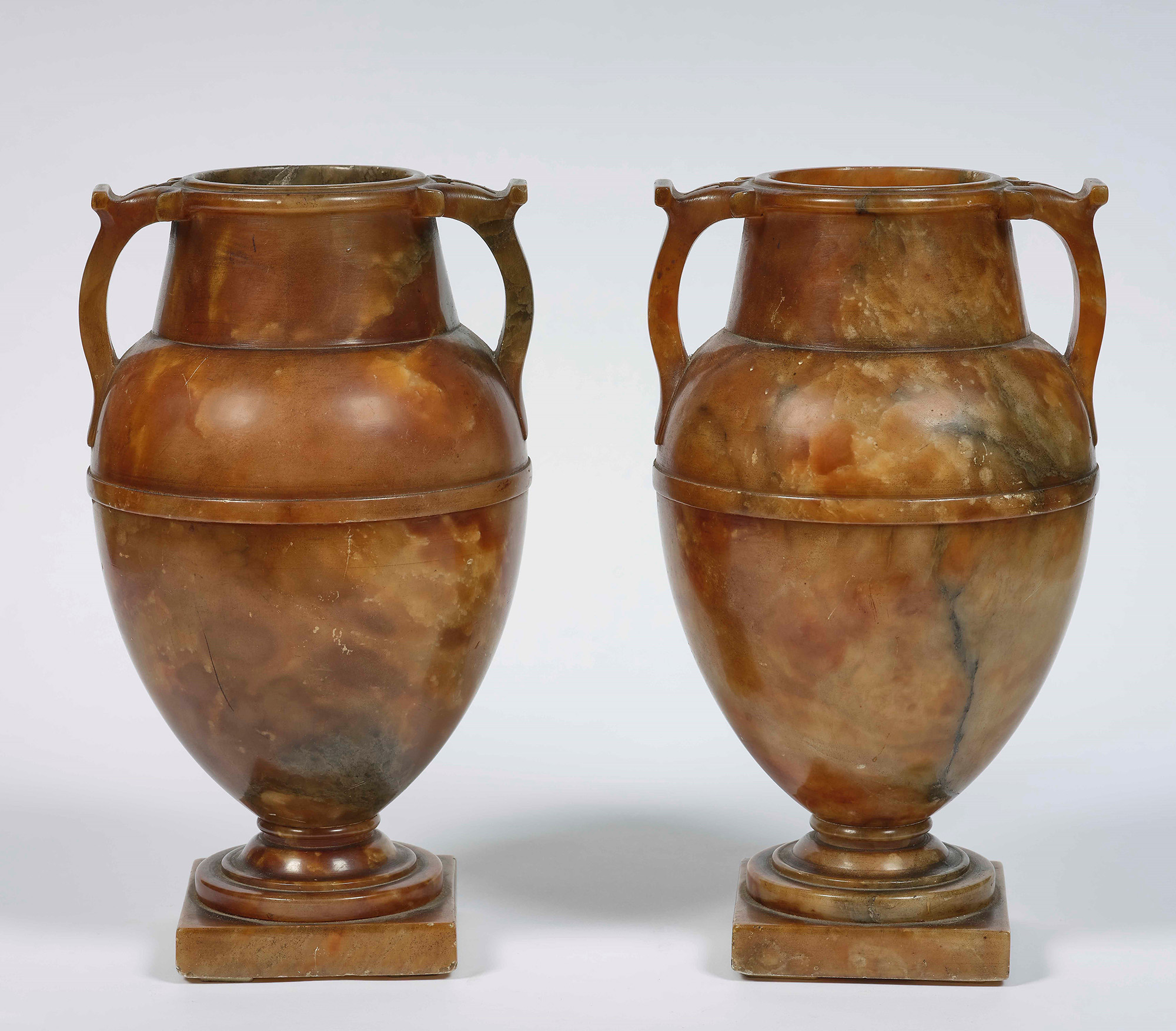 Coppia di vasi ad urna in alabastro. Arte neoclassica, XIX secolo altezza cm 31
