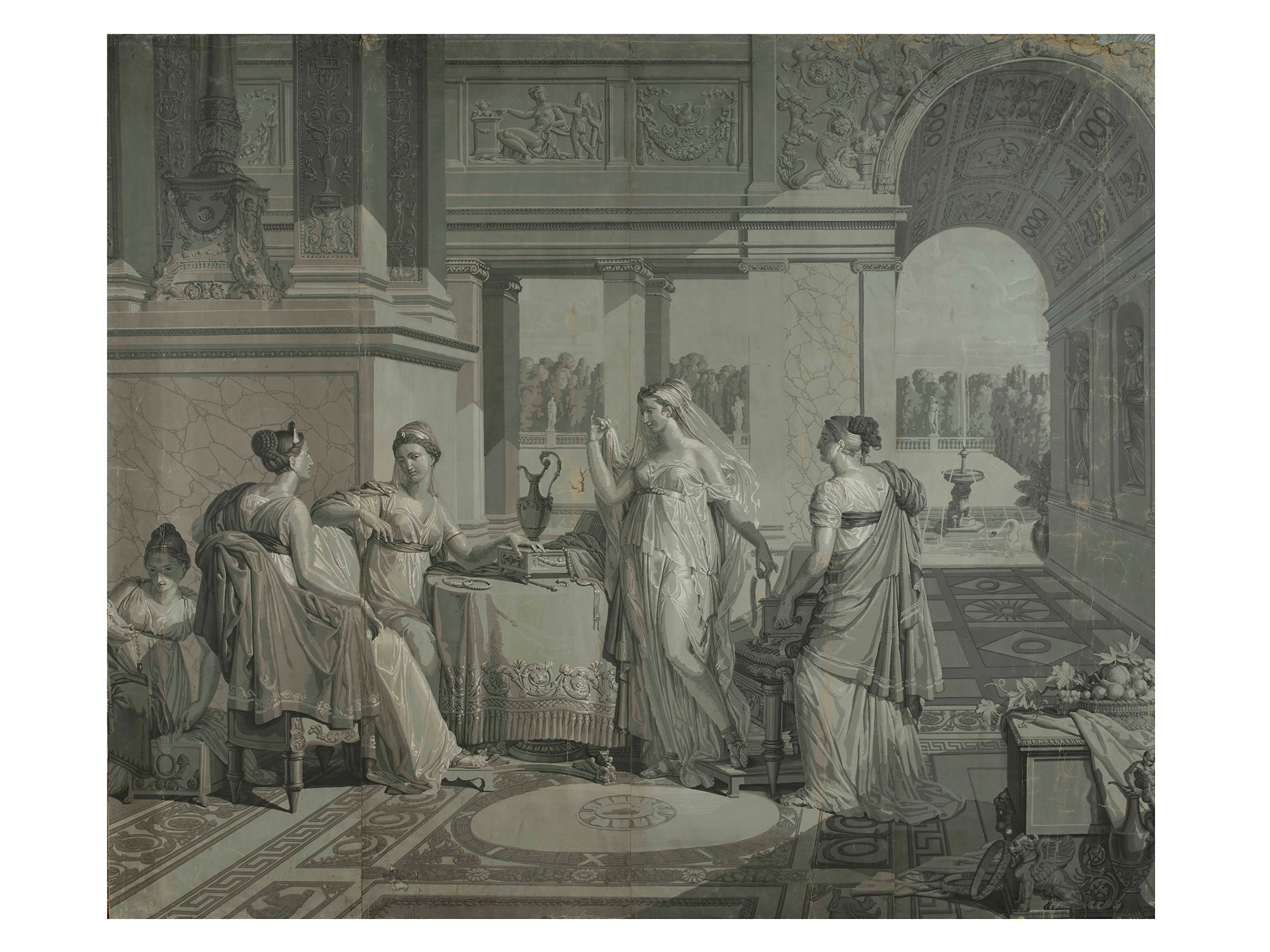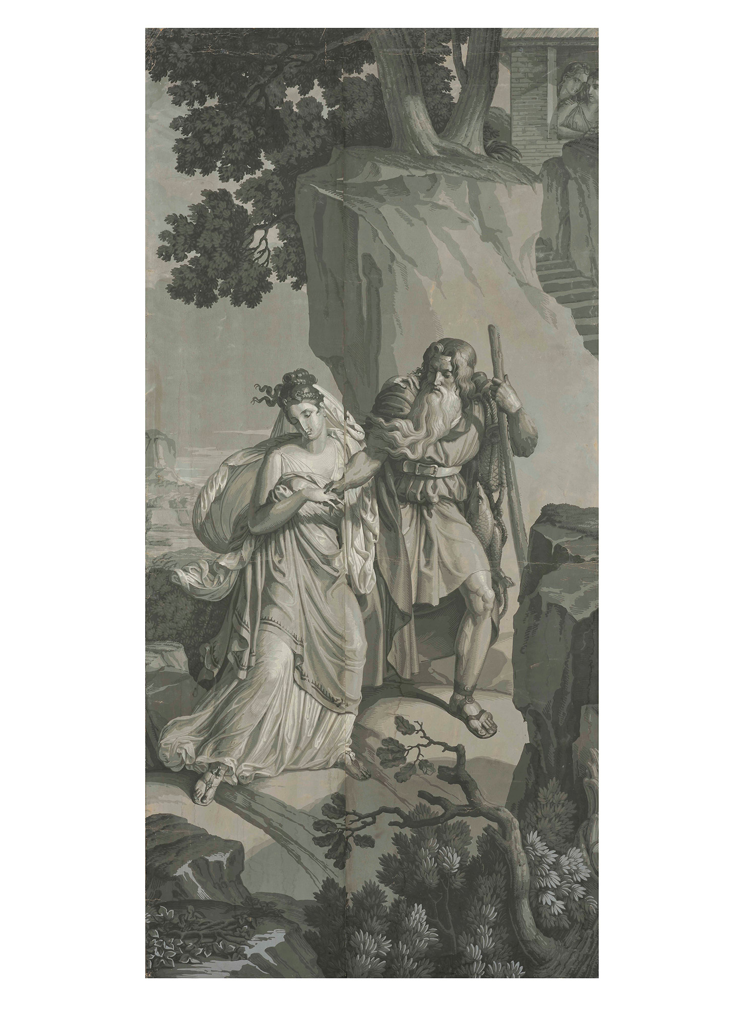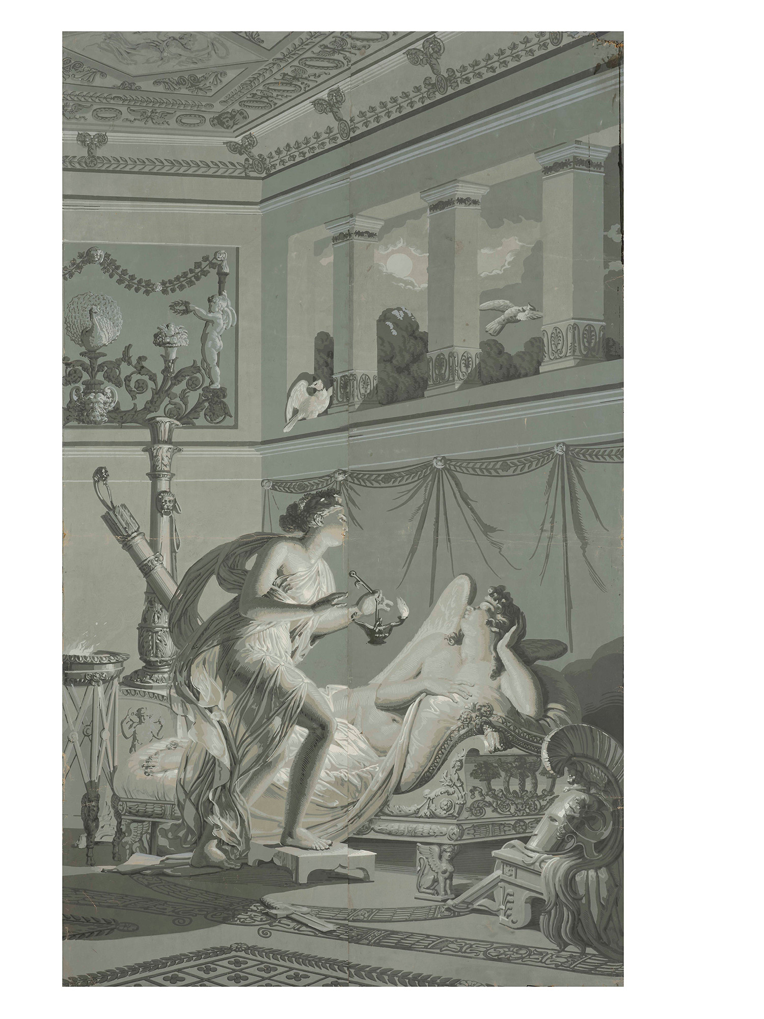 Merry-Joseph Blondel e Louis Lafitte, Psiche porta a Venere un vaso con l'acqua della Giovinezza; Psiche al bagno; I genitori di Psiche consultano l'oracolo di Apollo; Psiche trasportata da Zefiro; Psiche mostra i gioielli alle sorelle; Psiche tenta di pugnalare Amore addormentato; Psiche abbandonata; Psiche salvata da un pescatore; Psiche va agli Inferi; Psiche torna dagli Inferi; Riconciliazione di Venere e Psiche; Psiche e Amore Dodici papiers peints. Manifattura Dufour, Parigi inizio XIX secolo, Tempera grigia e biacca su carta intelata, 2 pannelli cm 180x212; 2 pannelli cm 180x160; 4 pannelli cm 180x53; 1 pannello cm 180x88; 3 pannelli cm 180x106, Antichità Maurizio Nobile, Bologna, Odile Nouvel-Kammerer, Papiers Peints panoramiques, Musée des Art Decoratifs, Flammarion, Paris 1990, pp 262,263; , H. Clouzot, Le papier peint en France du XVII au XIX siècle, Paris, ed. Van Oest, 1931, tav. XXV-XXVI., Serie completa realizzata dalla manifattura francese Dufour e tratta dai disegni di Louis Lafitte e Merry-Joseph Blondel che, dal 1814 al 1816 a Parigi, collaborano alla realizzazione delle scene degli Amori di Psiche e di Cupido dal romanzo di Jean de La Fontaine, su carta dipinta in camaïeu (chiaroscuro) di grigio o di seppia. , , L’atelier di Joseph Dufour avviò, a inizio XIX secolo, una innovativa decorazione per interni, i papiers peints su grandi fogli, in grado di fare concorrenza alla classica tappezzeria e alle più costose pitture murali. , A tiratura limitata, impresso a mano o con cliché di legno, il prodotto consentiva di realizzare una sorta di panorama continuo sulle pareti delle dimore, con l’intento di una fruizione tutta privata., La carta destinata al rivestimento delle pareti rivelava capacità di messa in scena particolarmente suggestive, per mezzo di fermi-immagine, come nel caso delle “Storie di Amore e Psiche” presentate in questo lotto, caratterizzate da una grande attenzione per la resa dei particolari e da una linea morbida e sinuosa., , L’atelier Dufour inaugurò la serie “Amore e Psiche” nel 1819 alla Exposition des produits de l'industrie francaise di Parigi, riscuotendo immediato successo sia in Francia che all’estero, sulla scia di quello già raggiunto nell’esposizione del 1806 dai panorami di ampia metratura eseguiti dallo stesso atelier e dedicati ai Sauvages de la Mer Pacifique, conosciuti anche come Les Voyages du Capitaine Cook., A differenza del carattere esotico, tipicamente francese dell’inizio del secolo, dei “Selvaggi del Pacifico”, la serie “Amore e Psiche” è ispirata al gusto neoclassico, rimanendo pertanto legata sia alla favola che all’antichità classica., , , Bibliografia: , , ,