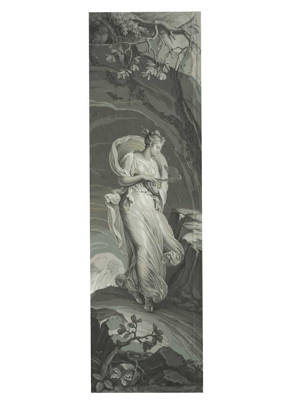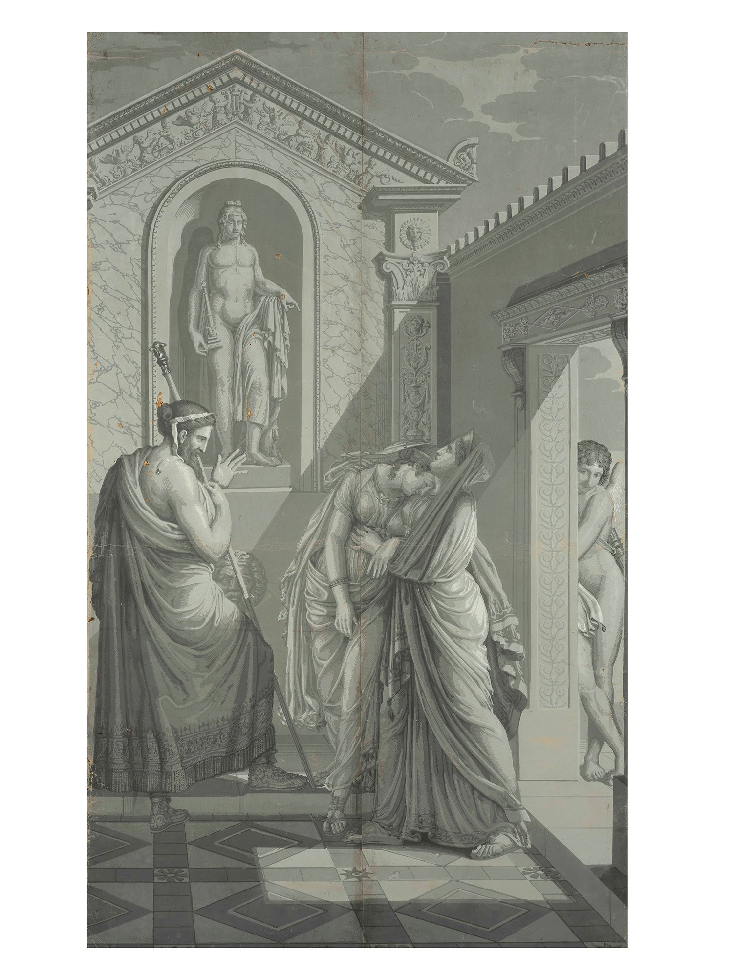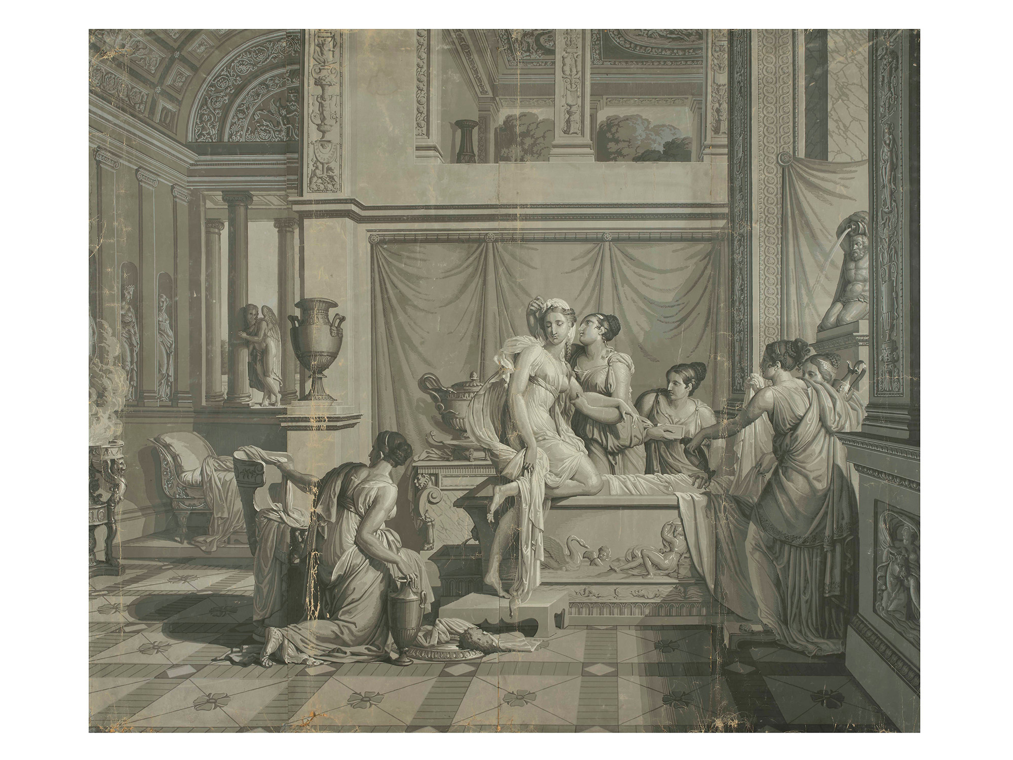 Merry-Joseph Blondel e Louis Lafitte, Psiche porta a Venere un vaso con l'acqua della Giovinezza; Psiche al bagno; I genitori di Psiche consultano l'oracolo di Apollo; Psiche trasportata da Zefiro; Psiche mostra i gioielli alle sorelle; Psiche tenta di pugnalare Amore addormentato; Psiche abbandonata; Psiche salvata da un pescatore; Psiche va agli Inferi; Psiche torna dagli Inferi; Riconciliazione di Venere e Psiche; Psiche e Amore Dodici papiers peints. Manifattura Dufour, Parigi inizio XIX secolo, Tempera grigia e biacca su carta intelata, 2 pannelli cm 180x212; 2 pannelli cm 180x160; 4 pannelli cm 180x53; 1 pannello cm 180x88; 3 pannelli cm 180x106, Antichità Maurizio Nobile, Bologna, Odile Nouvel-Kammerer, Papiers Peints panoramiques, Musée des Art Decoratifs, Flammarion, Paris 1990, pp 262,263; , H. Clouzot, Le papier peint en France du XVII au XIX siècle, Paris, ed. Van Oest, 1931, tav. XXV-XXVI., Serie completa realizzata dalla manifattura francese Dufour e tratta dai disegni di Louis Lafitte e Merry-Joseph Blondel che, dal 1814 al 1816 a Parigi, collaborano alla realizzazione delle scene degli Amori di Psiche e di Cupido dal romanzo di Jean de La Fontaine, su carta dipinta in camaïeu (chiaroscuro) di grigio o di seppia. , , L’atelier di Joseph Dufour avviò, a inizio XIX secolo, una innovativa decorazione per interni, i papiers peints su grandi fogli, in grado di fare concorrenza alla classica tappezzeria e alle più costose pitture murali. , A tiratura limitata, impresso a mano o con cliché di legno, il prodotto consentiva di realizzare una sorta di panorama continuo sulle pareti delle dimore, con l’intento di una fruizione tutta privata., La carta destinata al rivestimento delle pareti rivelava capacità di messa in scena particolarmente suggestive, per mezzo di fermi-immagine, come nel caso delle “Storie di Amore e Psiche” presentate in questo lotto, caratterizzate da una grande attenzione per la resa dei particolari e da una linea morbida e sinuosa., , L’atelier Dufour inaugurò la serie “Amore e Psiche” nel 1819 alla Exposition des produits de l'industrie francaise di Parigi, riscuotendo immediato successo sia in Francia che all’estero, sulla scia di quello già raggiunto nell’esposizione del 1806 dai panorami di ampia metratura eseguiti dallo stesso atelier e dedicati ai Sauvages de la Mer Pacifique, conosciuti anche come Les Voyages du Capitaine Cook., A differenza del carattere esotico, tipicamente francese dell’inizio del secolo, dei “Selvaggi del Pacifico”, la serie “Amore e Psiche” è ispirata al gusto neoclassico, rimanendo pertanto legata sia alla favola che all’antichità classica., , , Bibliografia: , , ,