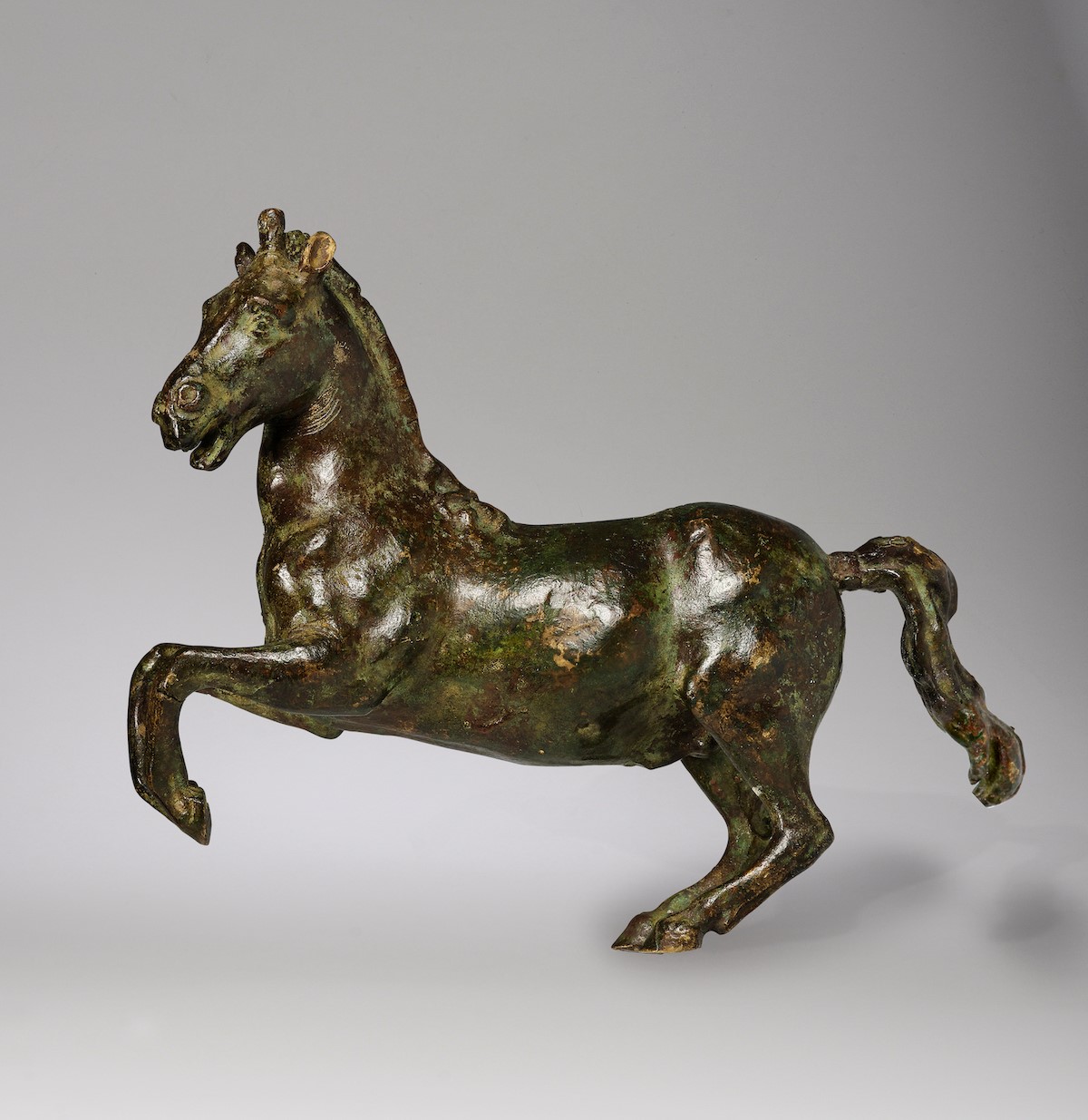 Cavallo in corvetta. Bronzo fuso, cesellato e patinato. Fonditore rinascimentale toscano, XVI secolo La vigorosa figura, ispirata ai paradigmi della classicità antica e caratterizzata da una patina indotta di gusto archeologico, appartiene alla produzione di cavalli in posa rampante di gusto rinascimentale collocabili tra il XVI e XVII secolo derivanti da modelli leonardeschi. Per molti di questi lavori, come spiega Luca Siracusano nella scheda critica che descrive l'opera, "[...] nell'ultimo secolo si è proposto il nome di Giovan Francesco Rustici (Firenze 1475 - Tours 1554), autore delle famose zuffe del Museo Nazionale del Bargello e del Musee do Louvre o di uno scultore parimenti attivo in Francia come Lorenzo Naldini [...]" e porsegue " Il nostro cavallo ha una criniera tagliata molto corta, pettinata in un ciuffo sopra la fronte e lasciata cadere liberamente presso il garrese. Forse la suggestione leonardesca si mescola qui a certe memorie dell'antico, desunte da opere come il cavallino ellenistico del Museo Archeologico Nazionale di Firenze [...]" e così conclude: "[...] Il nostro esemplare invece in virtù del carattere ruvido della fusione, quasi priva di rinettatura, sembra rinviare a una cultura più arcaica, ancora cinquecentesca [...]", , W. 19 - D. 7 - H. 24 cm, CFR: "Die Italienischen Bronzestatuetten der Renaissance" Wilhelm Bode, Berlino 1922; "Donatello e il suo tempo. Il bronzetto a Padova nel quattrocento e nel cinquecento" ed. Skira, Padova 2001.