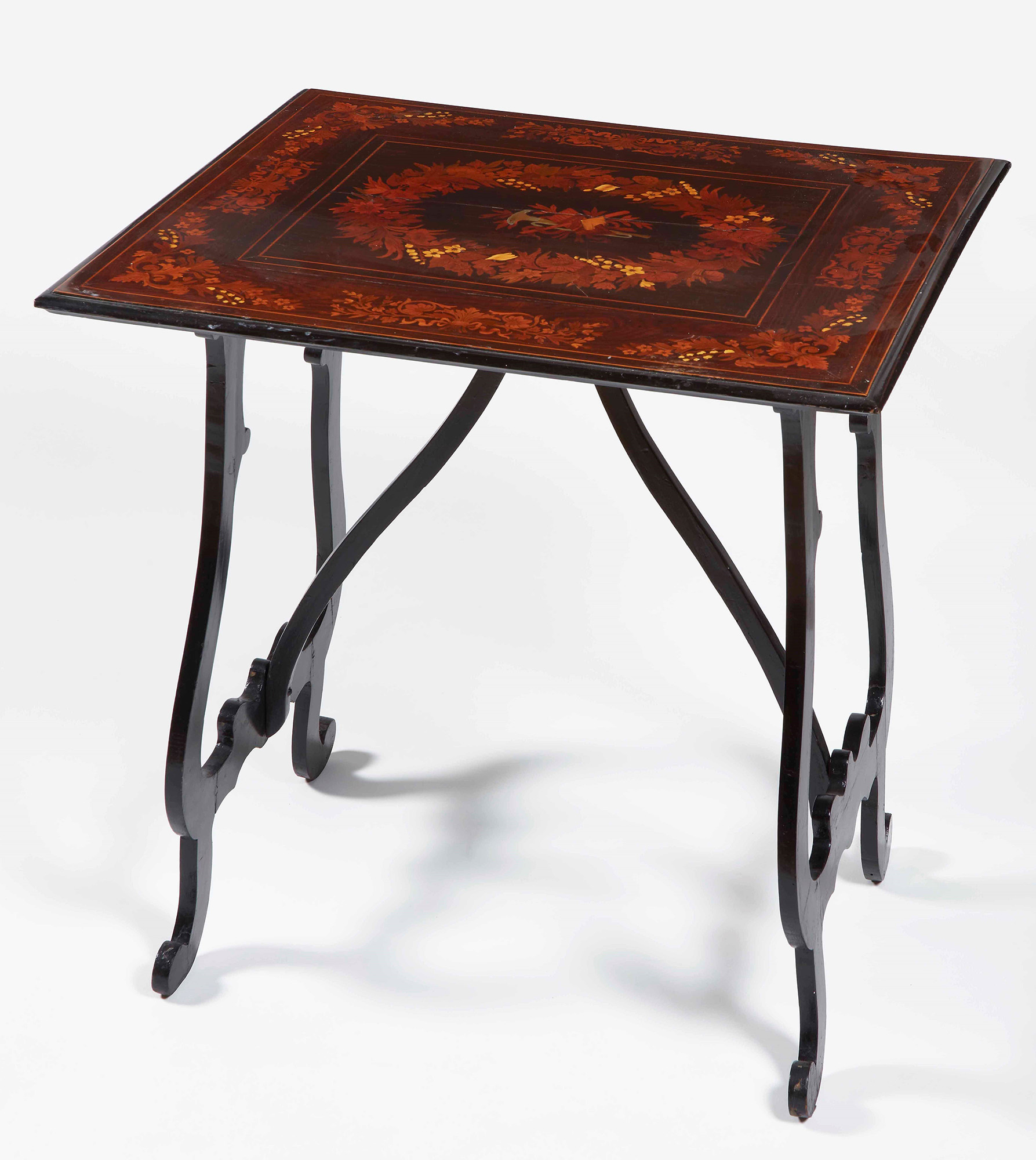 Tavolo in legno con sostegni a lira ebanizzati. Firenze, XIX secolo Piano intarsiato a motivi floreali e ghirlanda centrale con trofeo di strumenti musicali, W. 70 - D. 60 - H. 74 cm