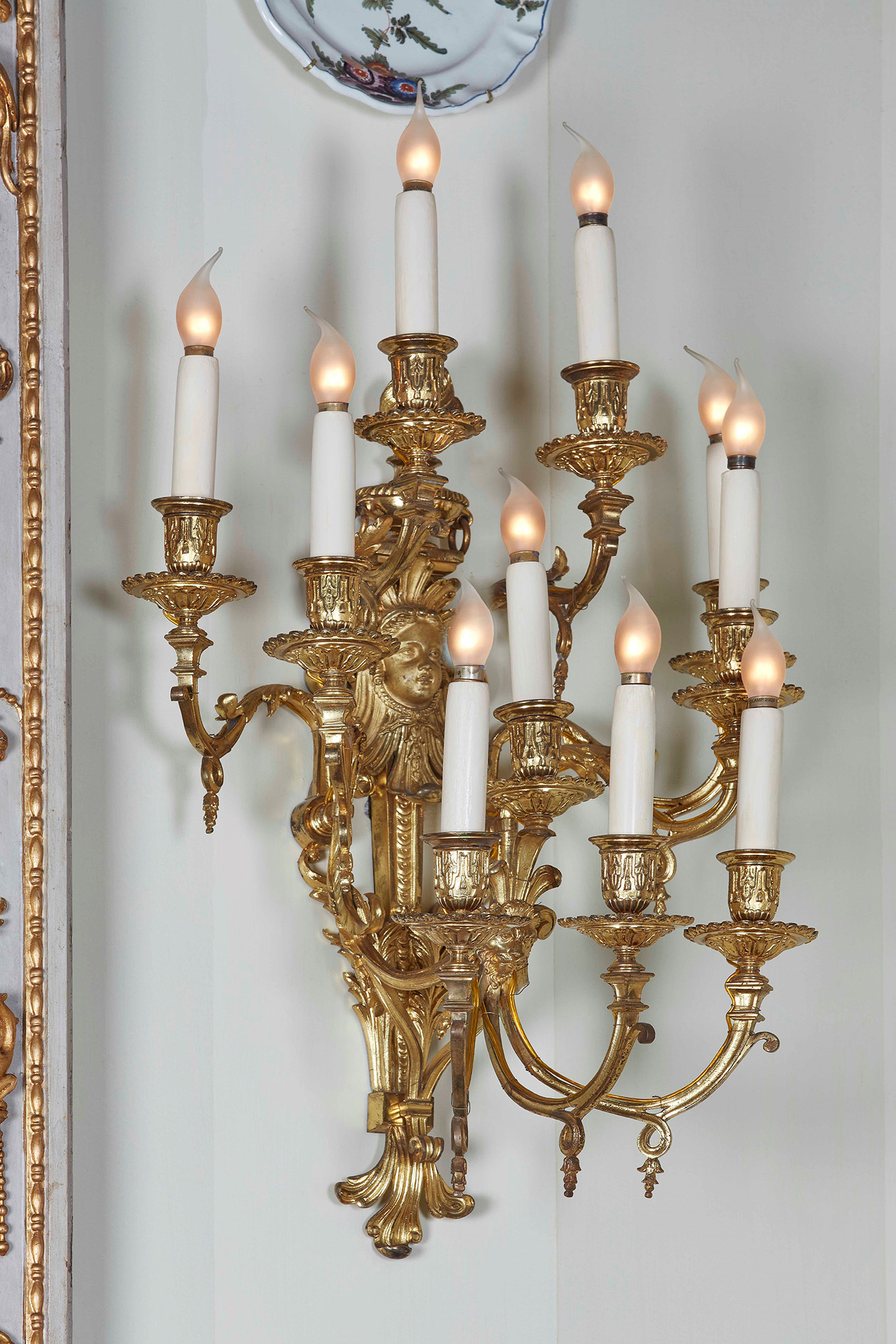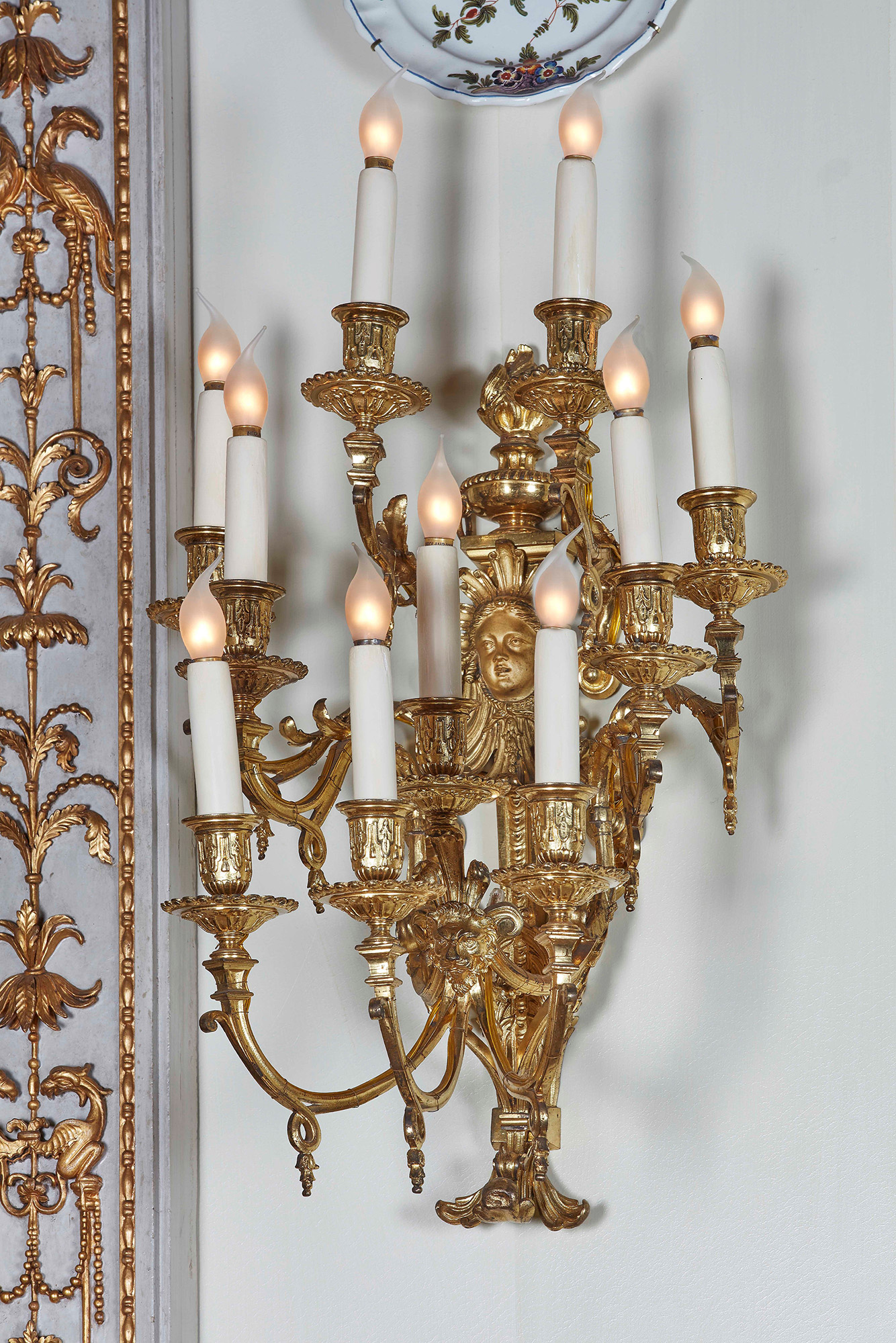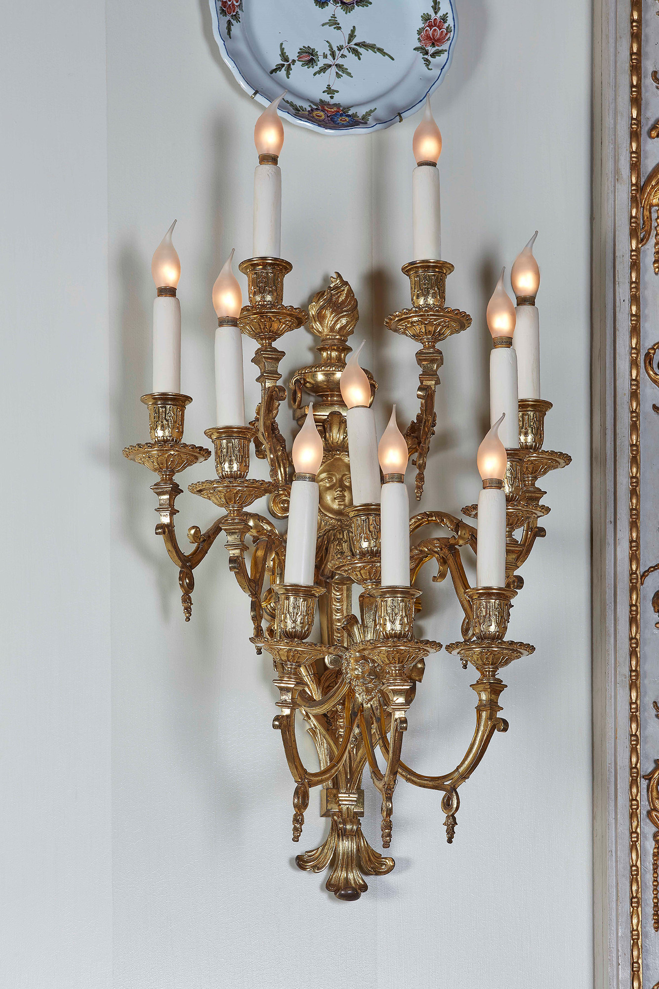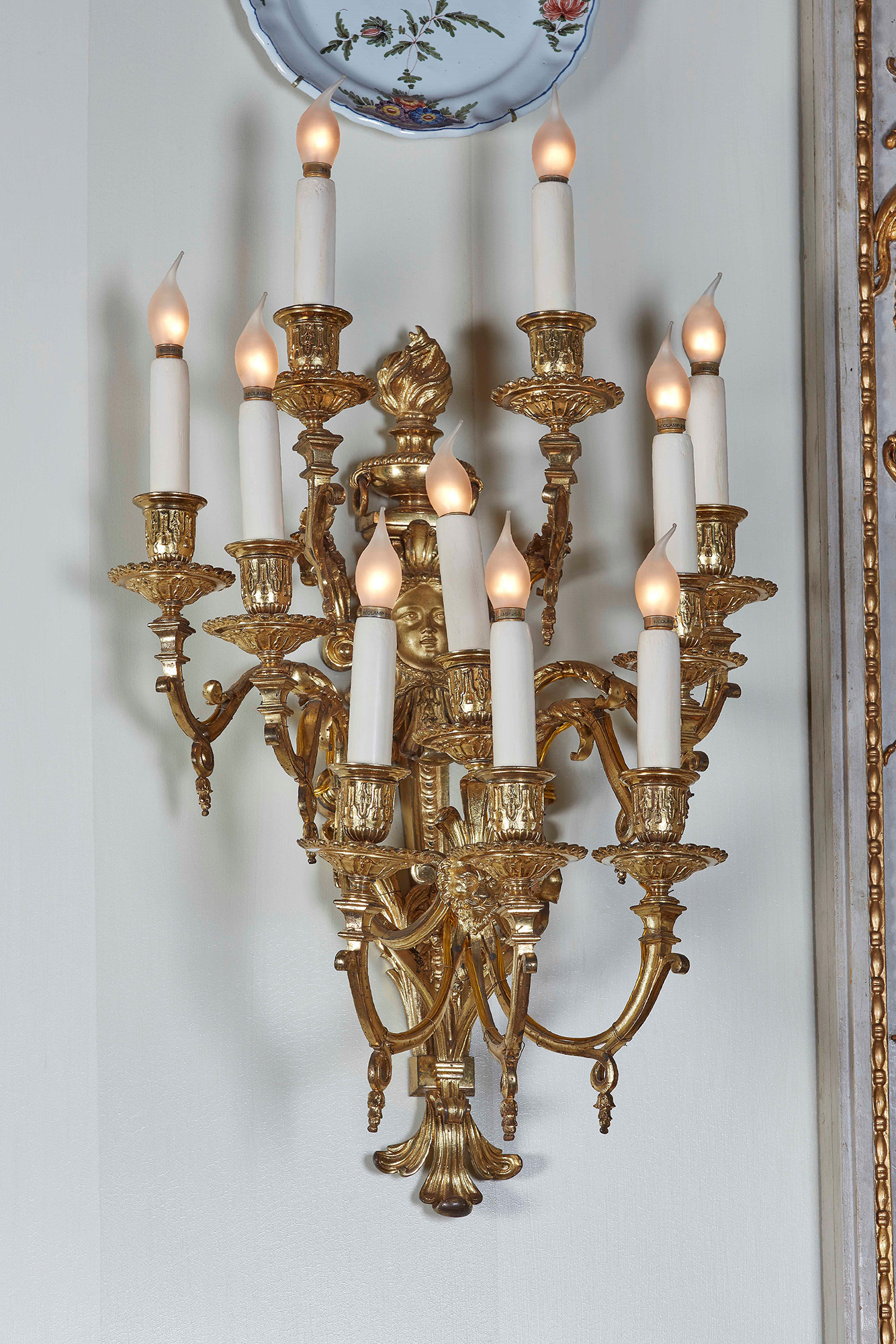Serie di otto appliques in bronzo cesellato e dorato a dieci fiamme. Epoca Napoleone III, XIX secolo Il fusto sormontato da un'urna fiammeggiante e una maschera da cui emergono i bracci, W. 40 - H. 60 cm, Christie's, asta 5053 Le XIXeme siècle, 17 giugno 2003, lotto 92;, Galleria d'Arte Armondi, Brescia