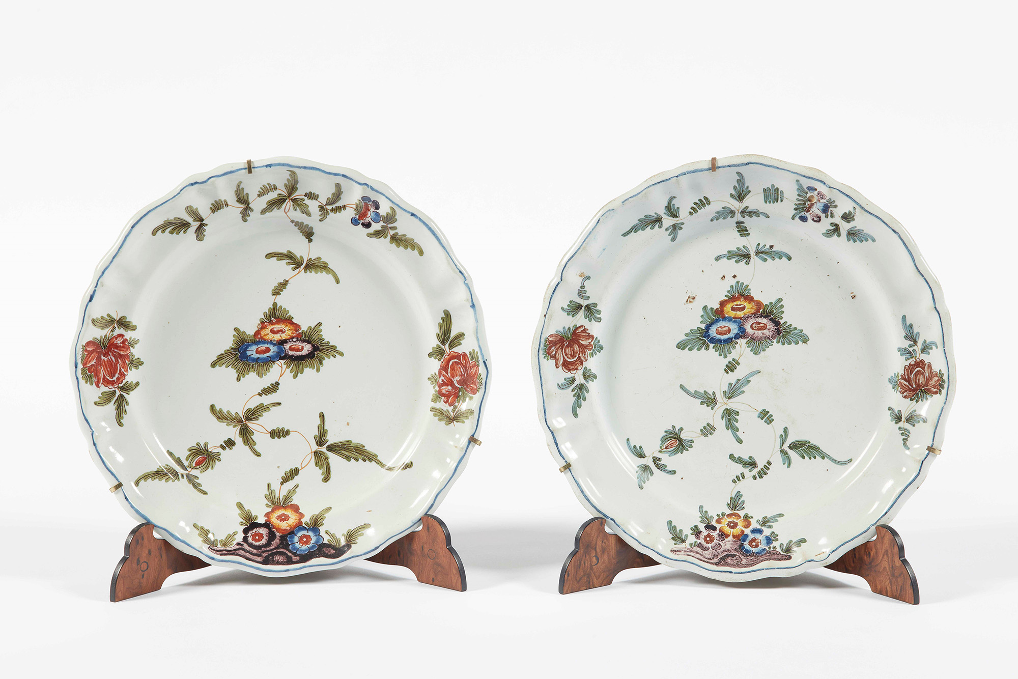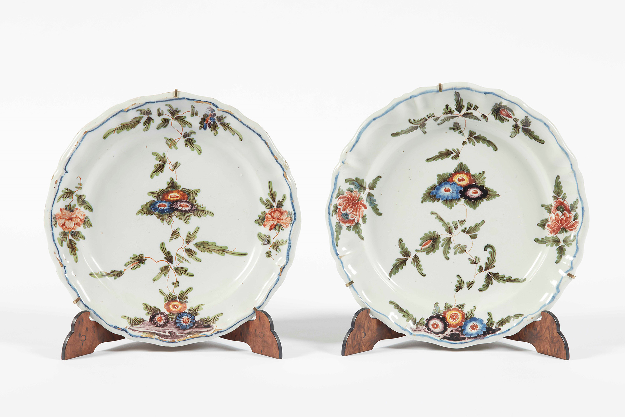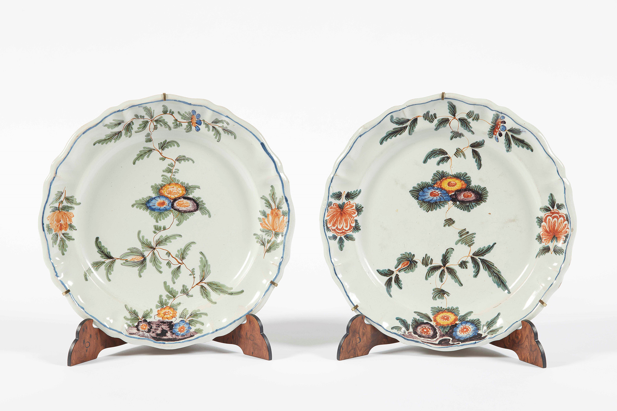 Assortimento di 46 piatti “a blanser” Nove, Manifattura Antonibon, 1740-1760 Maiolica decorata a gran fuoco. Marca: assente. Dimensioni: diametro piatti rotondi cm 23,5 circa; ovali cm 28 x 24 circa. Conservazione: ottima, , Questi piatti, 42 rotondi e 4 ovali, sono dipinti in policromia a gran fuoco con grandi tralci di fiori stilizzati, motivo comunemente conosciuto come “a tacchiolo” ma definito “blanser” negli inventari della manifattura, sicuramente uno dei più conosciuti e a lungo apprezzati temi decorativi della maiolica italiana settecentesca. Da zolle poste sulla tesa si dipartono sottili steli sinuosi e fogliati che portano tre fiori accorpati, Arte Antica di De Munari Delio, Vicenza