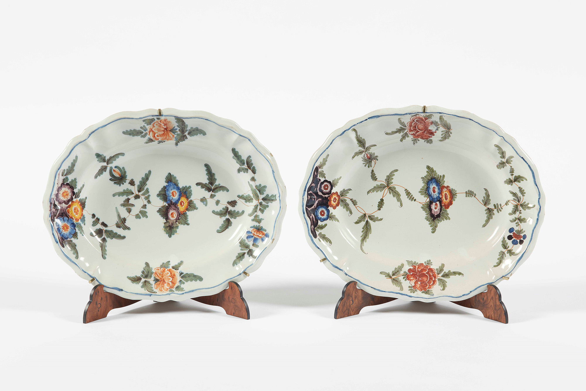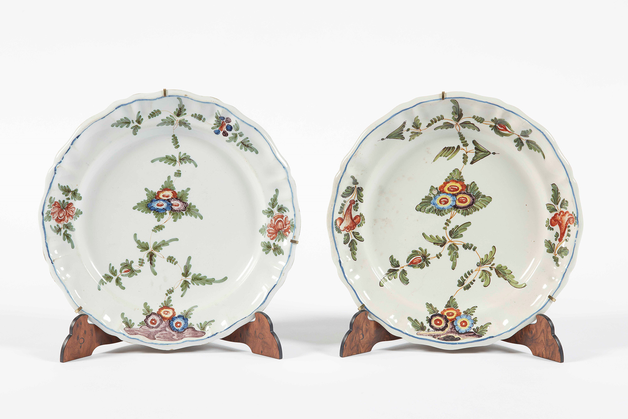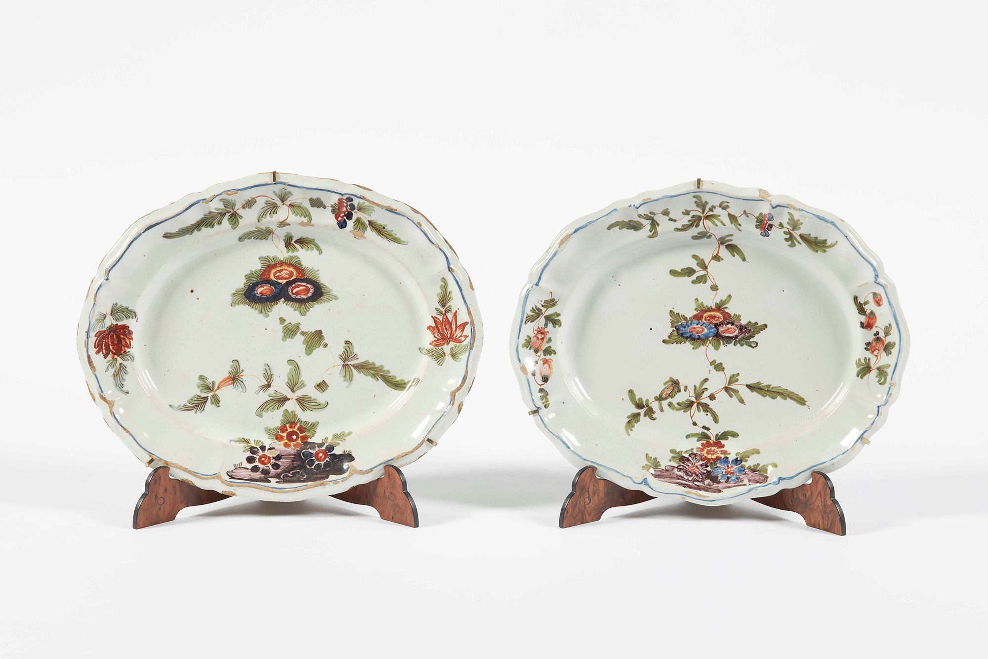 Assortimento di 46 piatti “a blanser” Nove, Manifattura Antonibon, 1740-1760 Maiolica decorata a gran fuoco. Marca: assente. Dimensioni: diametro piatti rotondi cm 23,5 circa; ovali cm 28 x 24 circa. Conservazione: ottima, , Questi piatti, 42 rotondi e 4 ovali, sono dipinti in policromia a gran fuoco con grandi tralci di fiori stilizzati, motivo comunemente conosciuto come “a tacchiolo” ma definito “blanser” negli inventari della manifattura, sicuramente uno dei più conosciuti e a lungo apprezzati temi decorativi della maiolica italiana settecentesca. Da zolle poste sulla tesa si dipartono sottili steli sinuosi e fogliati che portano tre fiori accorpati, Arte Antica di De Munari Delio, Vicenza