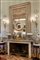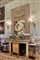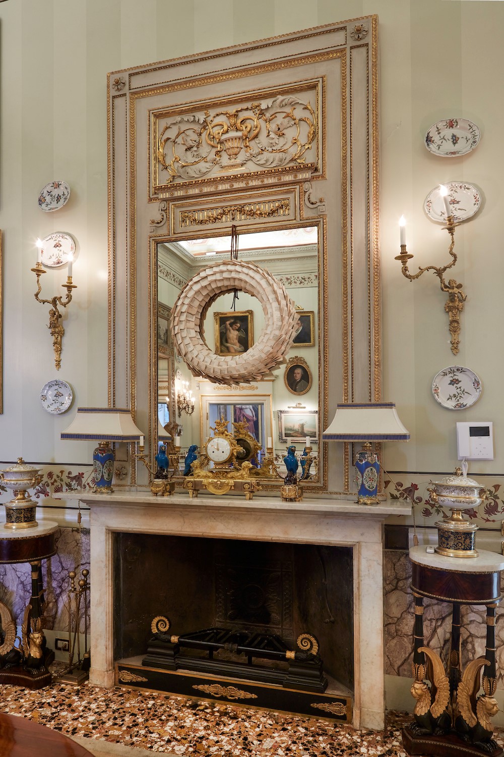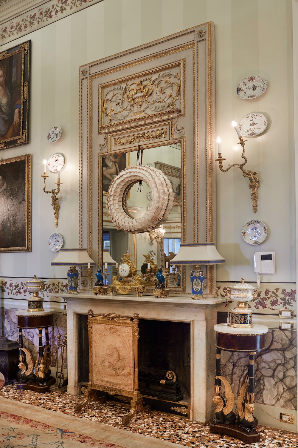 Caminiera Luigi XVI in legno intagliato, laccato e dorato. Fine XVIII secolo Cornice a doppio ordine ornata con modanature dorate, parte superiore intagliata a nastri e a vaso biansato da cui dipartono girali fogliati, W. 170 - H. 275 cm